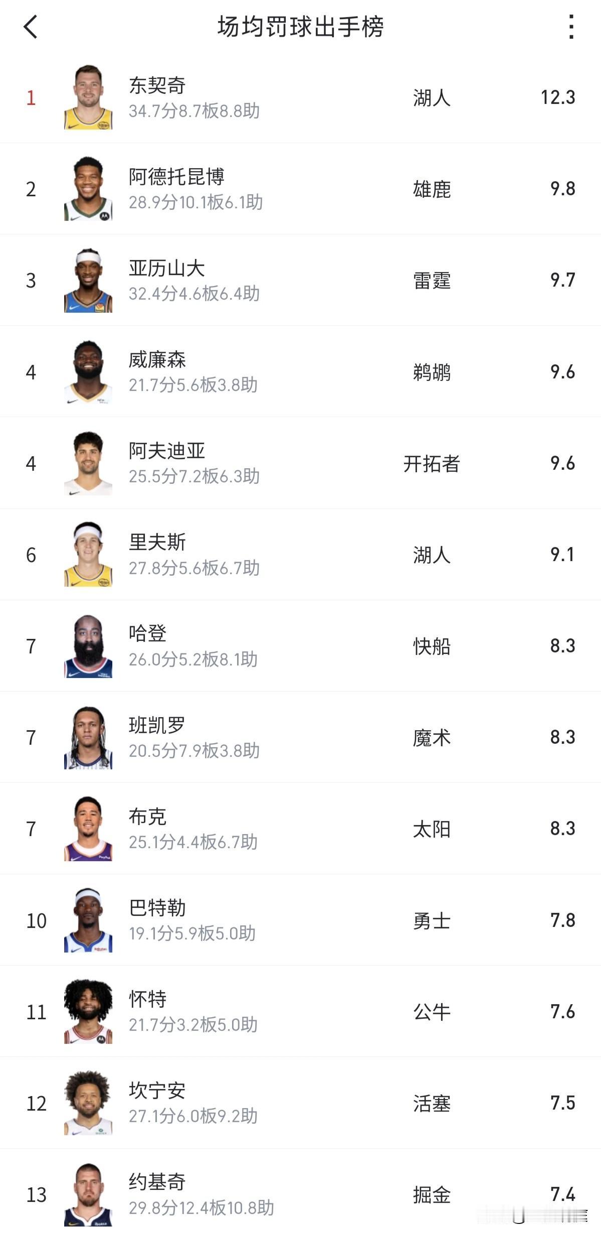 东契奇真的是有“巨星哨”呀,场均12.3次罚球比第二的字母哥多2.5次,亚历山大只能排名第三,哈登现在快船躺平的感觉居然还有8.3次能排名第7位,约基奇有7.4次还进不了前十,这个榜单没有詹姆斯、库里和杜兰特,看来属于他们的时代是真的过去了。