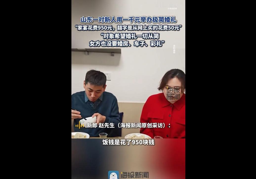 近日,山东东营赵先生与妻子办千元极简婚礼,无司仪、车队,仅两家人聚餐,酒自供、喜字 50 元,共花约 1000 元。 女方要求简单,岳父母未要彩礼还送贵重手机,视频走红获全国祝福,也引少数质疑。 这场婚礼最动人的,从来不止 “千元预算”,更是岳父母主动摒弃彩礼陋习的清醒。 当不少家庭还在为彩礼数额争执不休,把女儿的婚姻变成 “经济交易” 时,这对长辈用 “零彩礼 + 送贵重手机” 的行动,传递出最朴素的婚姻观 —— 嫁女儿不是 “卖女儿”,晚辈的幸福比面子和钱财更重要。 这种打破传统桎梏的家庭担当,比奢华婚礼更有力量,它证明婚嫁陋习的改变,往往始于一个家庭的勇敢选择,也为更多被彩礼绑架的家庭提供了参考样本。 有人质疑千元婚礼 “太寒酸”,实则是错把 “仪式感” 等同于 “花钱多”。 赵先生夫妇省去司仪的套话、车队的排场,选择两家人围坐聚餐,反而让婚礼回归了本质 —— 见证婚姻的是亲人的祝福,不是浮夸的形式。 当越来越多人开始效仿这种极简模式,就能逐渐消解 “婚礼必须奢华” 的焦虑,让婚姻回归爱情本身,而不是一场被消费主义裹挟的表演。