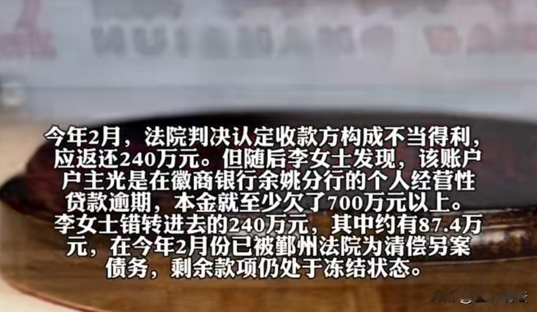 浙江宁波,女子240万转错账号,事发后女子起诉了收款方,后来法院判决收款方返还女子的240万元,因收款方欠了银行700万,还有其他外债,另外一个法院对账户内的款项依法强制扣划执行306200元和567800元,用于清偿另案的债务,女子提出执行异议,但法院认为女子无法对抗本案强制执行,女子不服。 李女士不明白,法院已经认定了陆莹(化姓)账户的钱是她错转的,也判决了陆莹返还自己的240万,另外一个法院有什么权利划80多万还给陆莹的其他债务人。 一提到这糟心事李女士就头疼,自己的钱被划扣了80多万不说,剩下的钱也被冻结。 她是真心后悔,后悔当初怎么就不仔细一点,要不然也不会有后面一系列的麻烦事,这事还要从一年前说起。 一年前,李女士的朋友杜女士找到她,说她向刘女士借了305万,对方要求她还钱,可自己手上只有65万,希望李女士能够借给她240万。 俩人是很好的朋友,一直以来都相互帮助,李女士二话不说就同意了。 可凡事都有例外,这么一大笔钱,李女士怕万一某一天说不清楚,于是俩人酒商量,各自都把钱转给她们共同的朋友王莹(化姓),再由她把305万转给刘女士。 2024年12月26日,李女士要把240万转给王莹时,当时刚好有电话进来,她直接输入“莹”字,接着就出现了银行卡号,她没有核对,直接就转账了。 240万转完之后,她联系了王莹,说钱已经转过去了,可对方却说没有收到,李女士懵了。 来不及多想,她赶紧查看转账记录,发现转错人了,这个人的名字也有一个“莹”,她叫陆莹,而自己的朋友叫王莹。 得知转错得第一时间,她赶紧给银行和公安打了电话。 事后,民警给陆莹打了电话,发现根本就打不通,于是民警建议李女士赶紧去法院。 对方电话打不通,李女士非常担心对方是故意不想把钱还回来,于是选择了起诉陆莹,要求其把钱还回来。 虽然之前已经联系了银行说明了情况,但李女士还是不放心,来到了银行了解情况。 得知陆莹的财产状况,李女士眼前一黑,差点没有晕过去。 银行告诉她陆莹欠他们银行700万,但表示不是他们银行的钱他们不会要,称不会动李女士转过来的钱,让李女士放宽心。 银行都这么说了,李女士想着只等法院的判决,到时候就可以把钱要回来。 可法院判决下来后,称陆莹收到李女士转过来的这笔钱是不当得利,要求10日内归还。 《民法典》第九百八十五条规定:得利人没有法律根据取得不当利益的,受损失的人可以请求得利人返还取得的利益。 既然法院已经判了,李女士觉得自己的钱就要回来了,想着终于可以松一口气了。 可没有想到,钱根本取不出来,因为陆莹的账户还被冻结着,法院告知是银行要求冻结的。 陆莹涉及了不少债务,李女士担心账户里面的钱会被划扣,只能向法院提出执行异议,要求停止对陆莹名下其它银行账户内剩余1832200元的执行,并解除上述款项的查封冻结。 可法院对账户内的款项仅采取冻结措施,李女士根本无法取走。 让李女士更加不服的是,另外一个法院对陆莹账户内的款项依法强制扣划执行306200元和567800元,用于清偿另案的债务。 对于李女士来说,陆莹账户内有240万属于她的,法院要扣划账户里面的钱,应当留下240元,多余的财产可以扣。 可事实上,法院并没有留足240万元,被划扣80多万后,陆莹的账户只剩下180多万。 李女士担心啊,这240万能不能回到自己手中,但想到陆莹账户中只有180多万,她就觉得自己的钱估计不能完全回到自己手上了。 对于法院划扣的80多万行为,李女士提出执行异议,可法院经审查后,李女士无法对抗本案强制执行,驳回她的执行异议,李女士不服裁定,已向法院提起异议之诉。 对于普通大众来说,钱错转了,只要证明了实属事实,把钱转回来不就可以了吗? 可现实中却没有这么简单,即使不像李女士所遭遇的这么复杂,也要经过各种程序,经过一定时间钱才能回到原主手中。