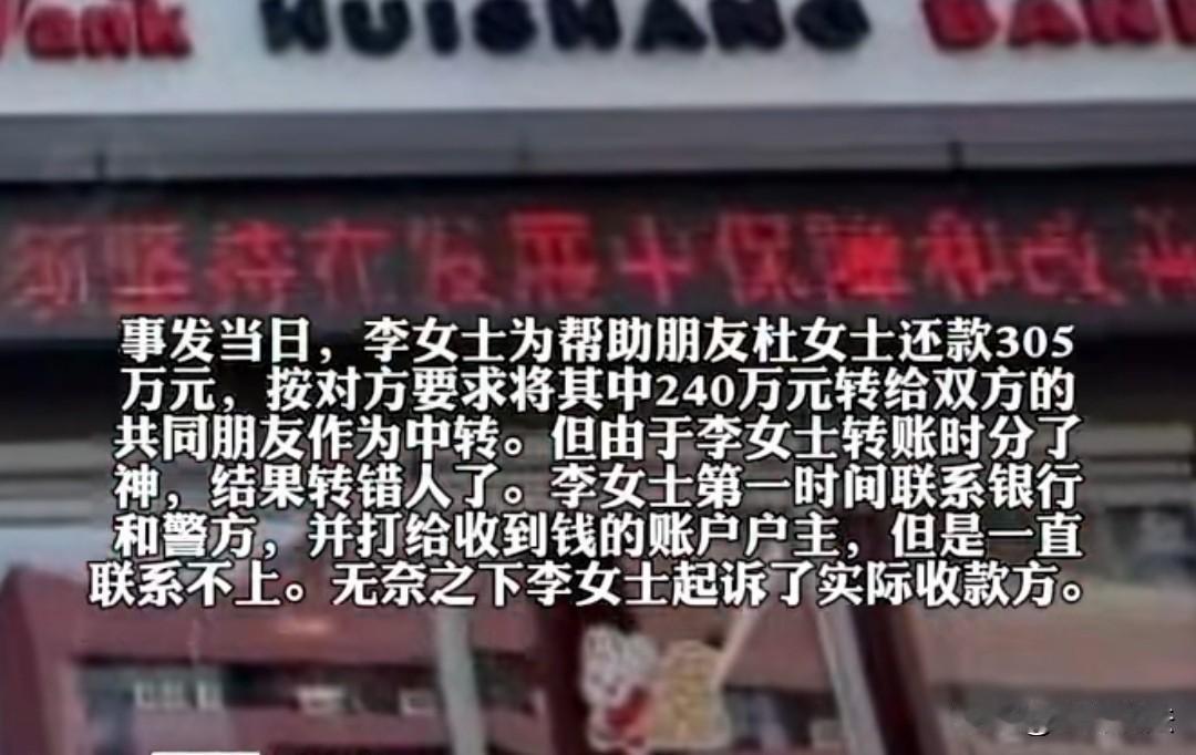 浙江宁波,女子240万转错账号,事发后女子起诉了收款方,后来法院判决收款方返还女