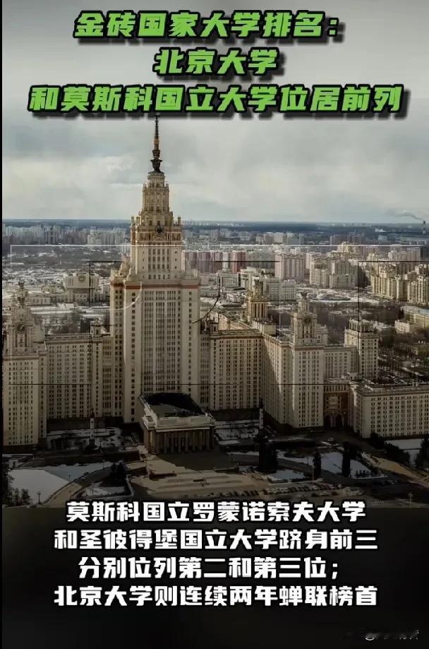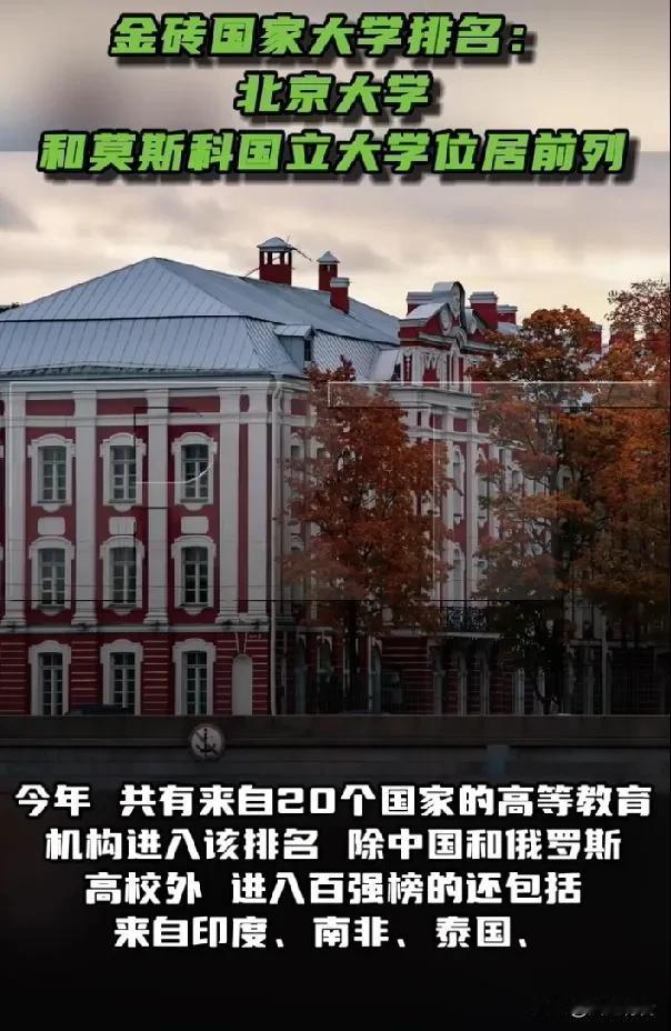 俄罗斯有关机构公布金砖国家大学排名榜单。 据《今日俄罗斯》报道,12月16日,俄罗斯莫斯科国际大学排名机构(MosIUR)发布了金砖国家大学排名。在金砖国家大学试点排名中,莫斯科国立罗蒙诺索夫大学和圣彼得堡国立大学跻身前三,分别位列第二和第三位;北京大学则连续两年蝉联榜首。 报道称,今年共有来自20个国家的高等教育机构进入该排名。除中国和俄罗斯高校外,进入百强榜的还包括来自印度、南非、泰国、巴西、马来西亚、印度尼西亚、沙特阿拉伯、白俄罗斯、阿联酋和埃及等十个国家的高校。 俄罗斯公布的这个榜单含金量如何呢?我们来看一看榜单前三甲在全世界大学里的排名,然后大家自行判断。 第一名,北京大学,它在2025年的世界大学排名中表现出色,QS世界大学排名第14名,软科世界大学学术排名第23位,U.S.News全球最佳院校排名第25名。 第二名,莫斯科国立罗蒙诺索夫大学,它在2025年的世界大学排名中,QS排名为第94位,US News排名为第451位,泰晤士高等教育世界大学排名尚未公布其2025年的具体排名,但在2024年为第95位。 第三名,圣彼得堡国立大学,它在2025年QS世界大学排名中位列第365位,在US-NEWS世界大学排名中位列第743位。