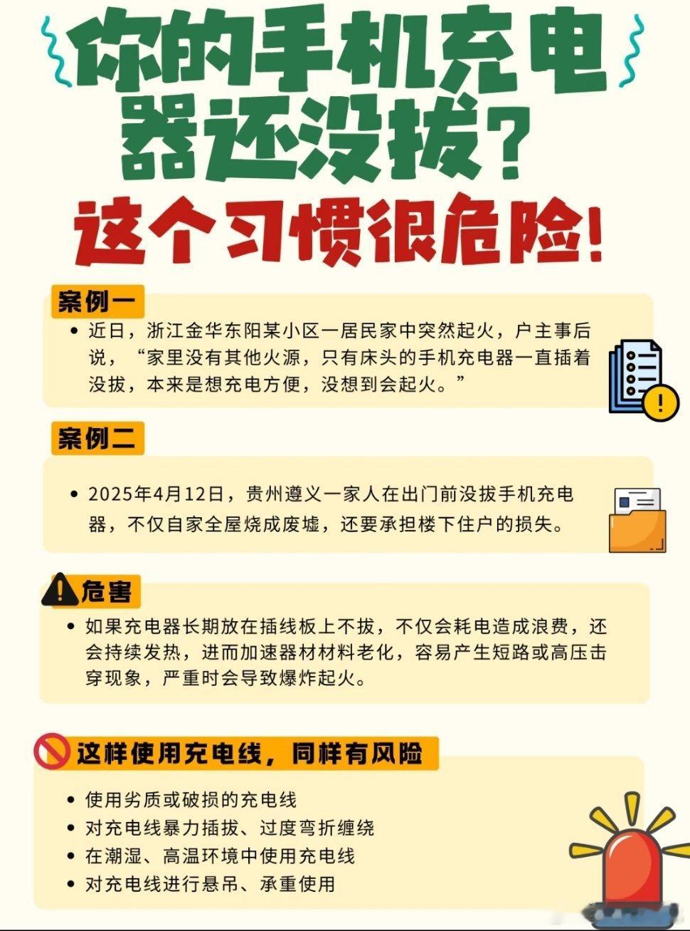 手机充电器千万不要一直插着不拔警惕!长期不拔的充电器是隐形火灾炸弹🔥很多人以为,不充电的充电器只是安静呆着…其实它一直悄悄“上班”❗️👉持续发热 🔥加速老化👉悄悄耗电 💸钱包受伤👉短路风险 ⚡️火灾隐患别让充电习惯变成危险源头!这些常见操作,你中招了吗?❌ 暴力插拔+si亡缠绕· 正确姿势:手握硬质插头部分· 收纳秘诀:宽松“8”字法🌀或线圈式❌ 潮湿/高温环境使用· 定期清理接口灰尘 ✨· 避开浴室/灶台等区域❌ 悬吊充电 · 线承重· 充电线不是晾衣绳!· 整机重量会损伤接口安全无小事✨🔸从今天起,养成好习惯:🔸充满就拔,省电又安全🔸选用认证产品,拒绝三无🔸拒绝暴力弯折,温柔对待🔸保持干燥,远离热源转发提醒身边人💕别让小小习惯酿成大隐患!手机充电器长期插着极易短路