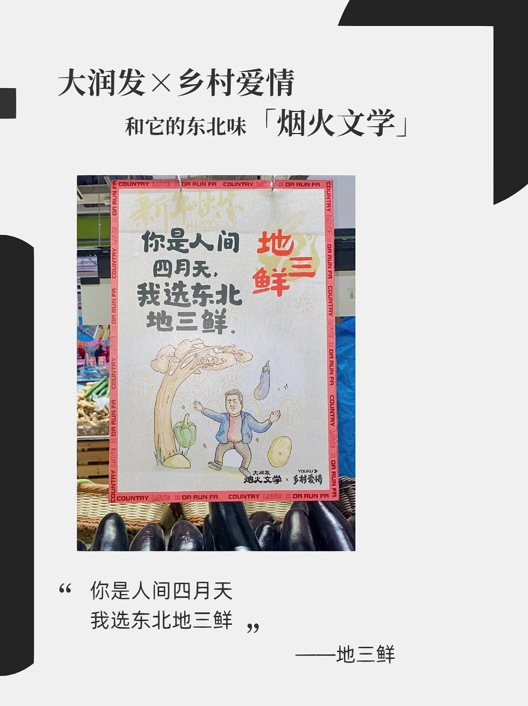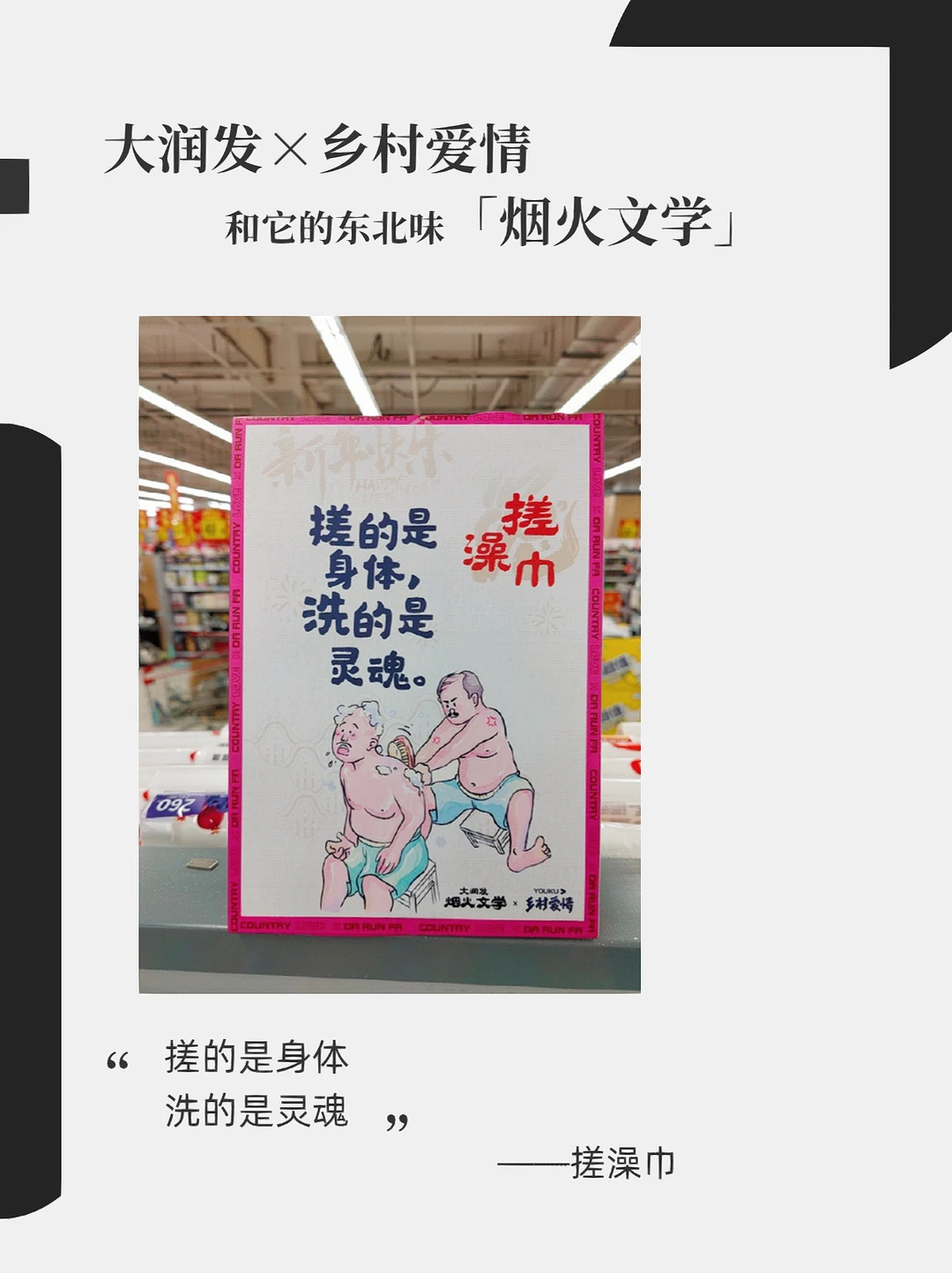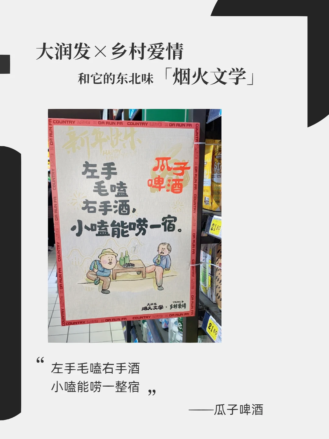 大润发x乡村爱情故事 东北味儿拉满的烟火文学 这个系列你觉得还能更新多久?[暗中观察R] 下回去逛大润发的时候留意下广告牌,说不定会有意外发现[笑哭R] - 文案: 左手毛嗑右手酒 小嗑能唠一整宿 ——瓜子啤酒 搓的是身体 洗的是灵魂 ——搓澡巾 扒我可以 扒瞎(虾)不行 ——虾 离了我斯斯哈哈 靠近我笑面如花 ——手套围巾 人生百味 学会自己调味 ——蘸酱菜 小伙睡凉炕 全靠火力壮 ——冰鲜鱼 你是人间四月天 我选东北地三鲜 ——地三鲜