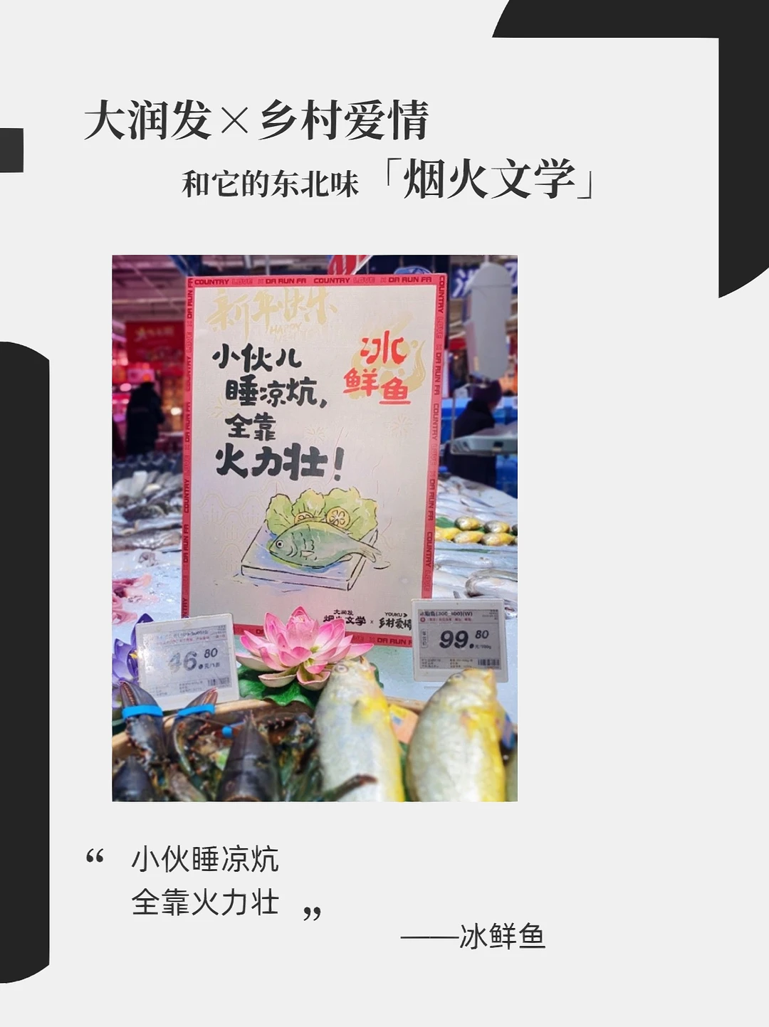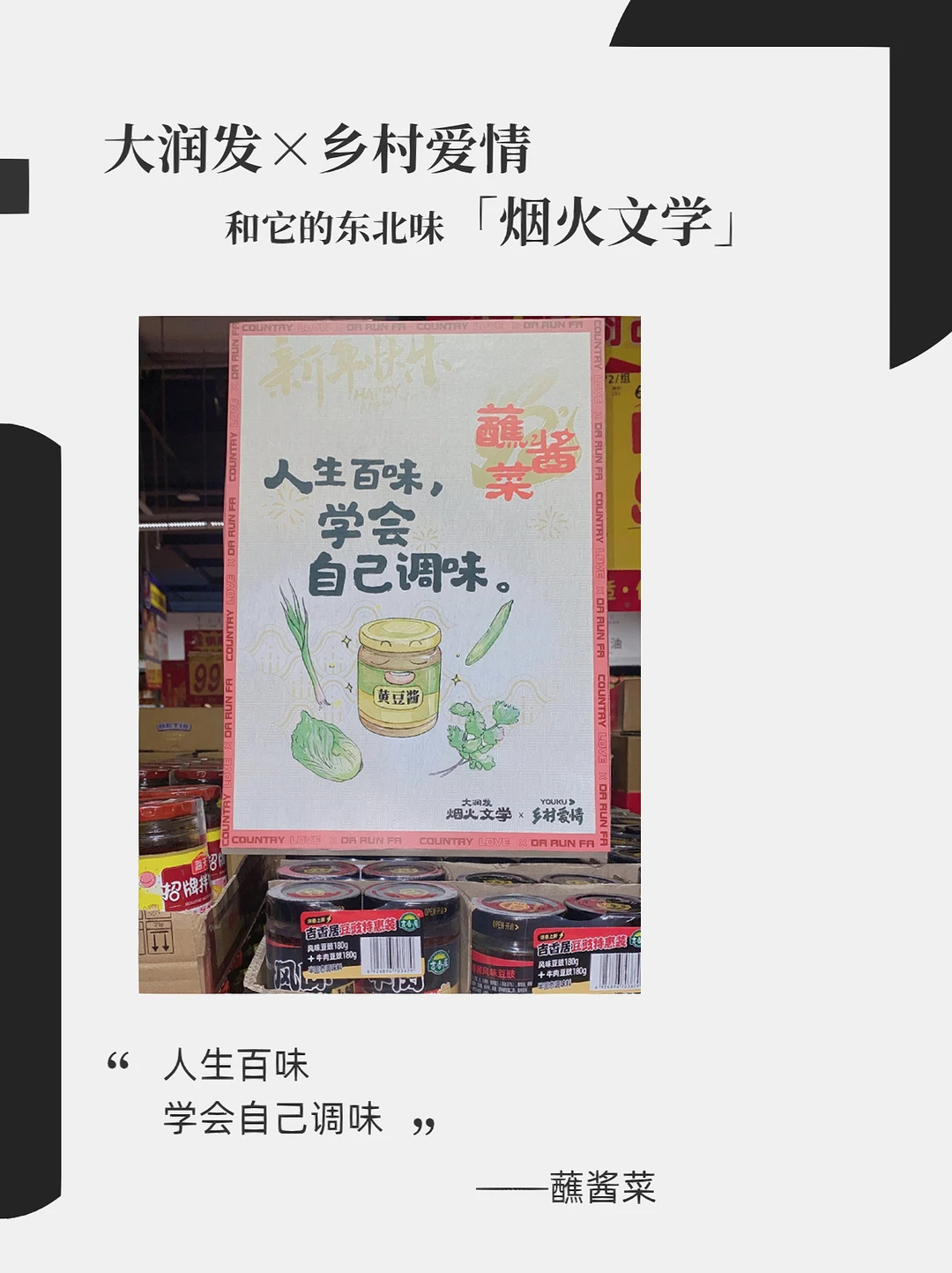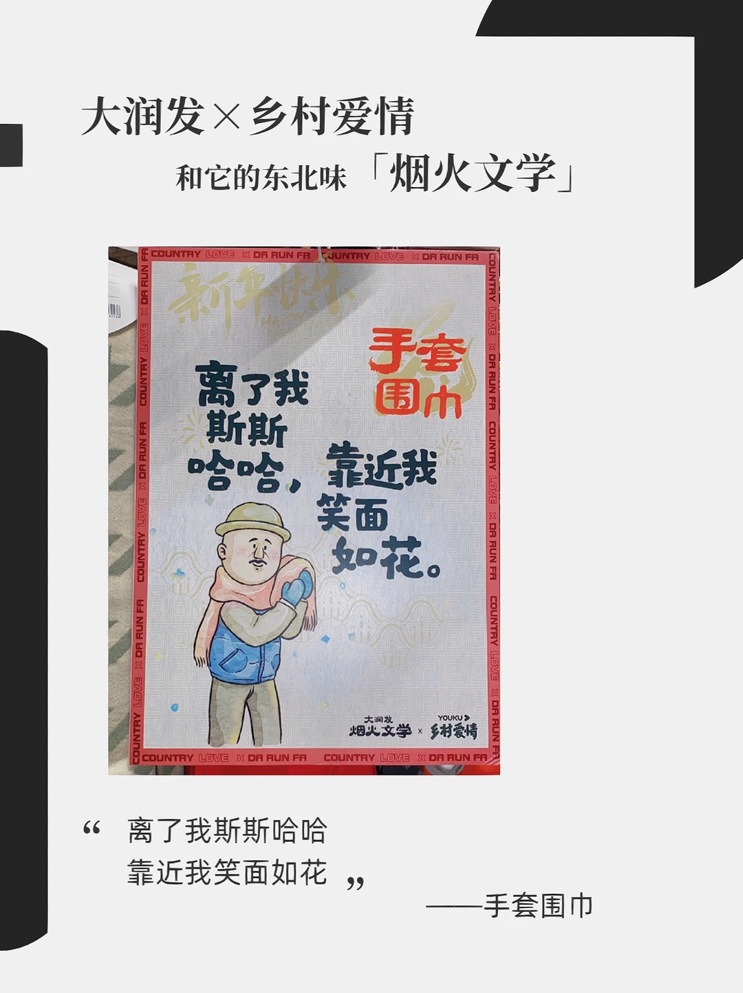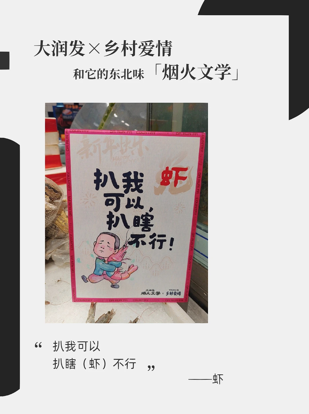 大润发x乡村爱情故事 东北味儿拉满的烟火文学 这个系列你觉得还能更新多久?[暗中观察R] 下回去逛大润发的时候留意下广告牌,说不定会有意外发现[笑哭R] - 文案: 左手毛嗑右手酒 小嗑能唠一整宿 ——瓜子啤酒 搓的是身体 洗的是灵魂 ——搓澡巾 扒我可以 扒瞎(虾)不行 ——虾 离了我斯斯哈哈 靠近我笑面如花 ——手套围巾 人生百味 学会自己调味 ——蘸酱菜 小伙睡凉炕 全靠火力壮 ——冰鲜鱼 你是人间四月天 我选东北地三鲜 ——地三鲜