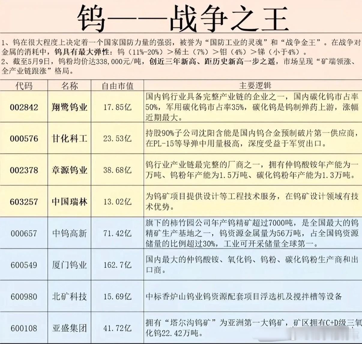 涨不停!不停涨!已破40万/吨,“战争金王”再上风口浪尖!你可能没听过仲钨酸铵,但市场已经炸了!最新数据显示,钨精矿价格突破40万元/吨,APT(仲钨酸铵)飙升至60万元/吨以上——双双刷新多年新高,且涨势还在加速!这不是普通涨价,而是一场由“硬核需求+稀缺供给”引爆的战略资源行情。钨,被称为“工业牙齿”,广泛应用于高端刀具、航空航天、新能源汽车、军工装备等关键领域。随着中国制造业向高精尖升级,对高性能钨材的需求激增;而国内矿山受环保限产、资源品位下降影响,供应持续收紧——供需缺口正在拉大。当前,钨已被列入我国《战略性矿产名录》,出口受限、战略地位凸显。国际市场上,欧美也在加速囤货,全球抢钨战悄然打响。钨,正从幕后走向台前,成为高端制造与国家安全双重逻辑下的硬通货。