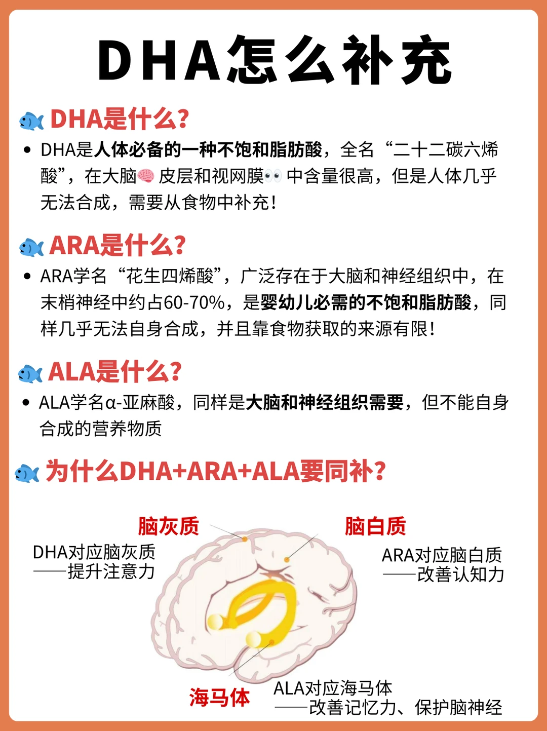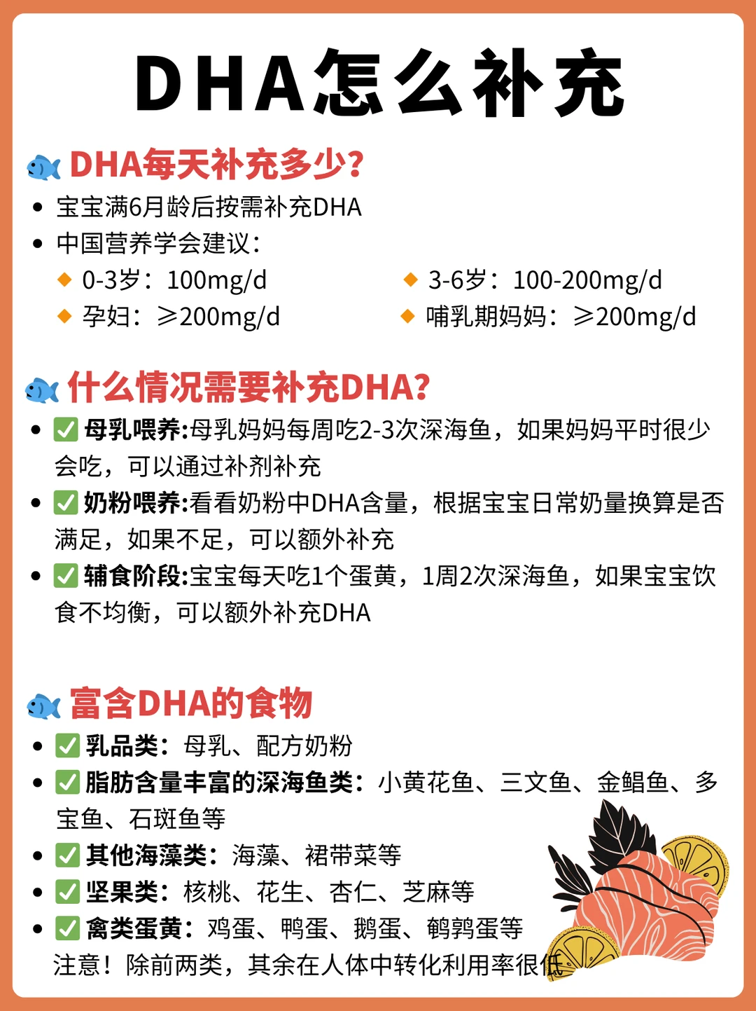 ⚠️ DHA获取的食物来源主要是深海鱼类脂肪,如果是非沿海或日常食用较少的,需要通过补充剂补充!
