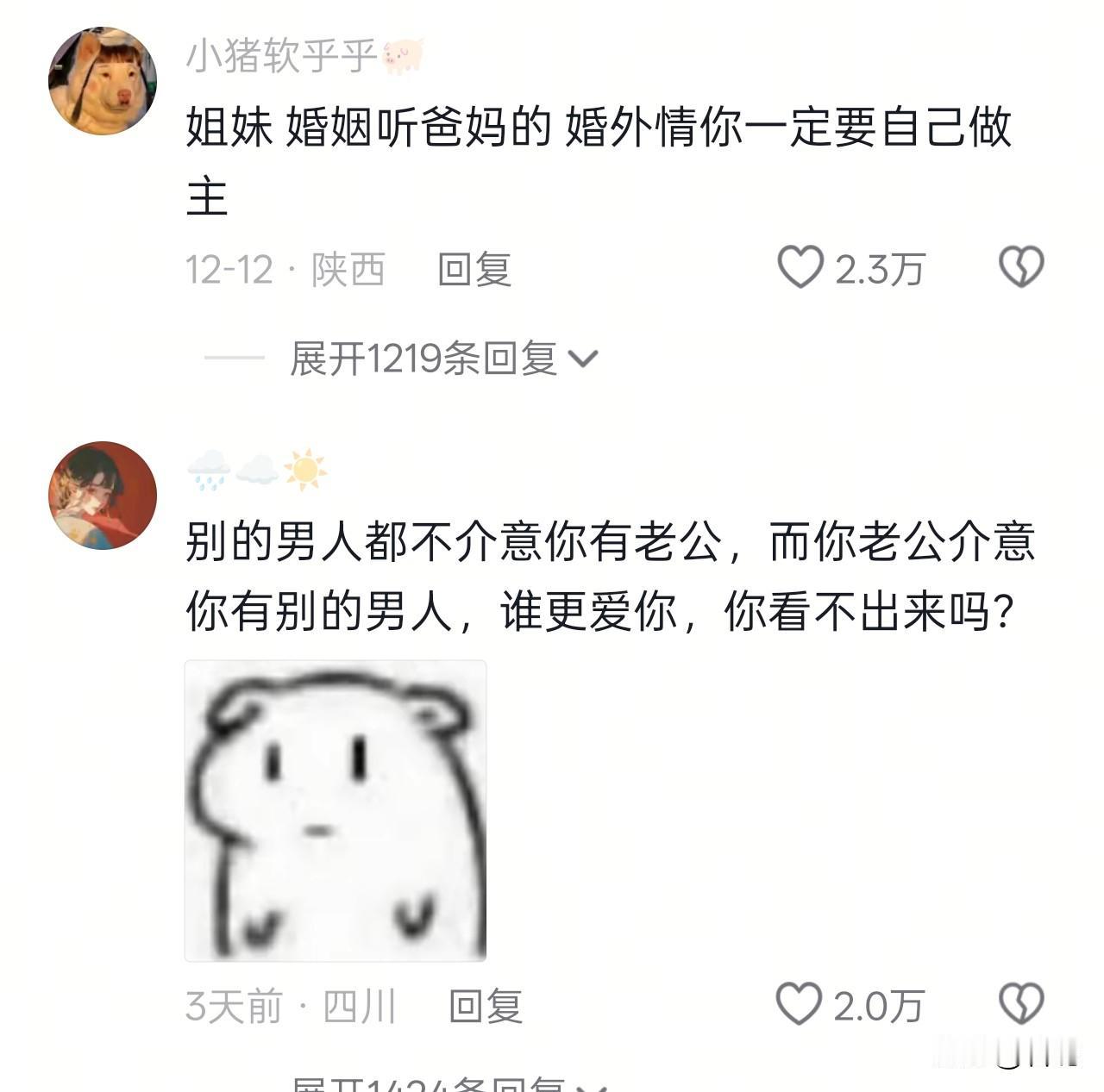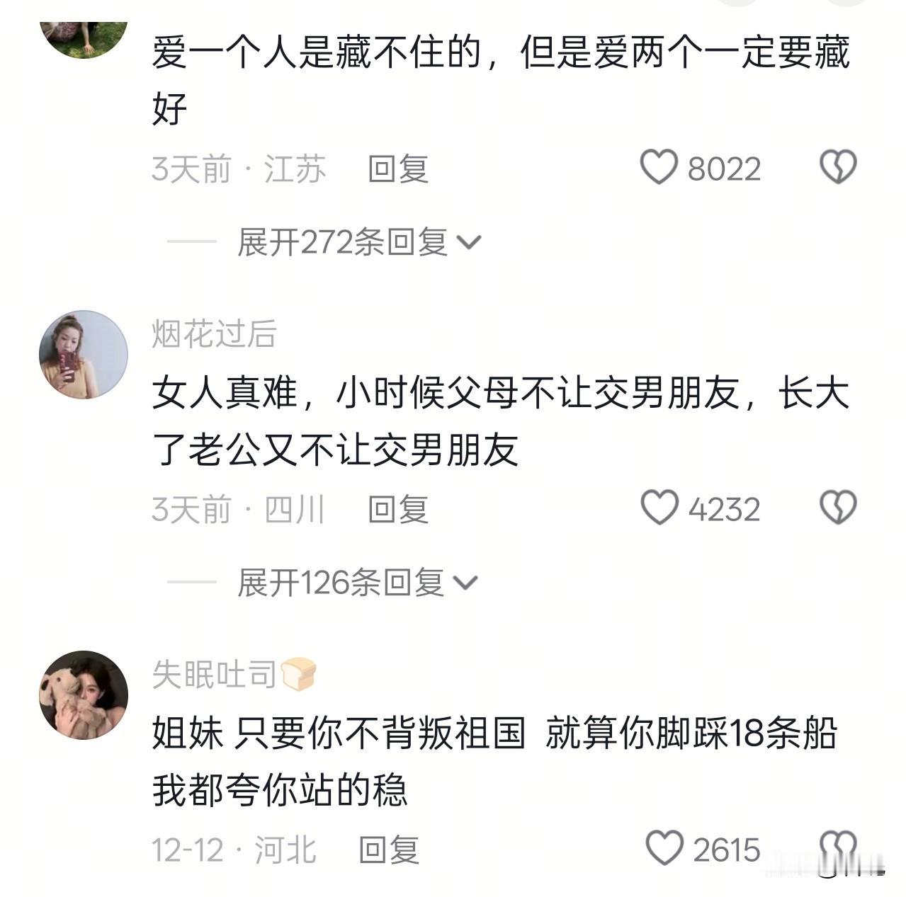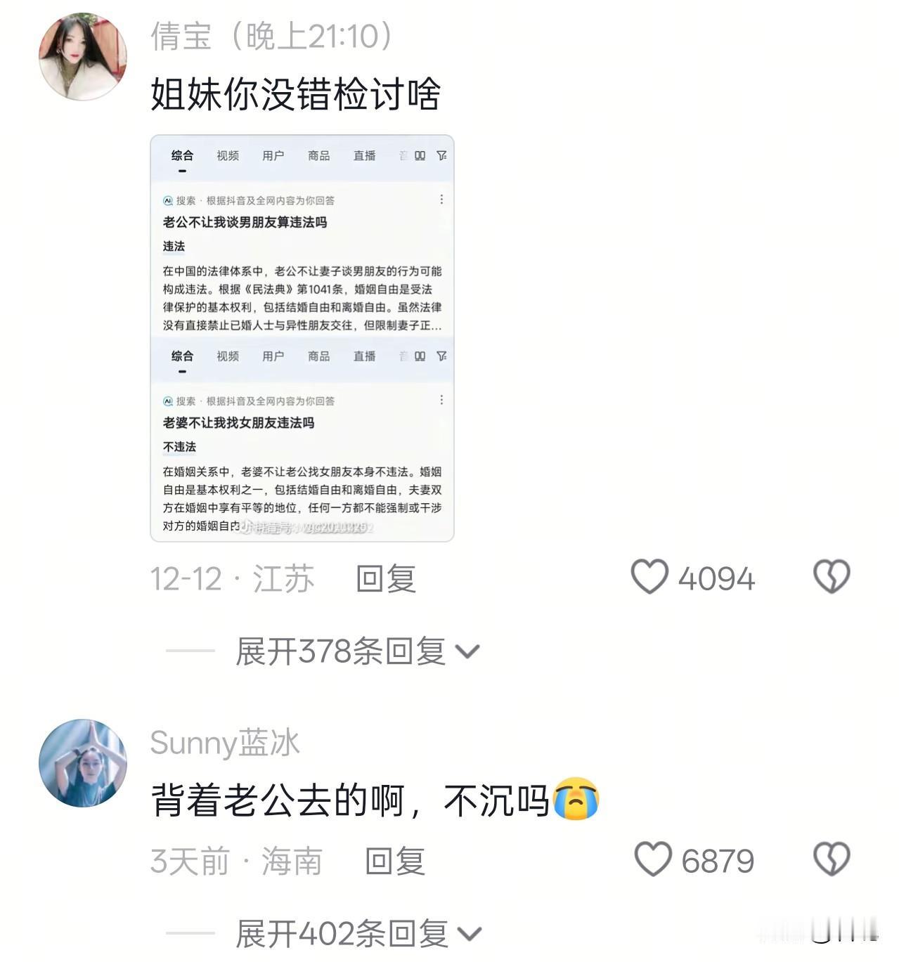 一美女出轨被抓抖音上公开道歉,我以为评论区应该算是批斗她,不守妇道。结果,我打开的哪里是评论区啊,简直就是新世纪的大门啊。 看完评论区才发现,原来女人早就想反了!甚至还有姐妹搬出法条证明老公不让老婆谈男朋友,违法!老婆不让老公谈女朋友,不违法! 第一次觉得双标如此伟大!看来我们还是按照国家法律走,不然显得我们不尊重国法。 所以,道歉是假,这是引流?