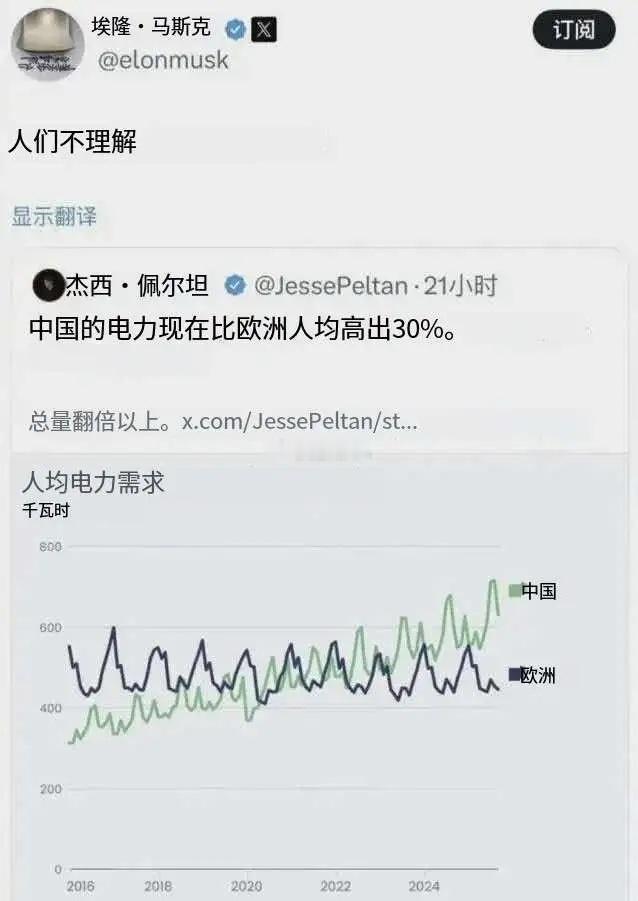 世界首富埃隆·马斯克在社交媒体上转发了一张图表,只配了一句话:“人们不理解。”这张图不是什么火箭设计图,而是一条简单却震撼的曲线——它显示,中国的人均用电量,已经超过了欧洲,而且领先幅度达到了30%。这条消息像一块石头,在全球舆论的湖面上激起了不小的涟漪。马斯克这句意味深长的点评,恐怕是说到了点子上:很多人,尤其是长期戴着有色眼镜看中国的人,确实“不理解”这个数字背后发生了什么。要理解这种“不理解”,我们得把时间往回拨一拨。图上那条绿色的中国线和那条蓝色的欧洲线,在多年前是另一个样子:欧洲线高高在上,中国线在下面紧紧追赶。那时的欧洲,代表着发达、现代和高品质生活,用电多似乎是理所应当。而中国,还是一个正在努力解决温饱、点亮更多灯的发展中大国。但故事没有停留在那一刻。在过去的十多年里,两条线的走势发生了根本性的逆转。中国的绿线开始强劲、稳定地向上攀升,而欧洲的蓝线却显得增长乏力,甚至徘徊不前。终于,在2023年,中国的年人均用电量首次超越了欧洲。这不是一夜之间的奇迹,而是一个国家几十年如一日,在工业、科技和民生领域埋头苦干的必然结果。这个超越,首先是中国庞大而活跃的经济体系的直接体现。我们的工厂在全速运转,为全世界生产商品;我们的数据中心昼夜不停,处理着海量信息;遍布城乡的5G基站和越来越多的电动汽车充电桩,都在持续消耗着电力。更重要的是,这些电实实在在地转化成了生产力、竞争力和普通人生活的便利。当你深夜还能点外卖、随时能给新能源汽车充电、工厂的机器24小时不停工时,这背后都需要一个强大、稳定且充裕的电力系统在支撑。反观欧洲,情况则复杂得多。一方面,欧洲正在经历激进的能源转型,试图减少对化石燃料的依赖,可再生能源的比例确实在提升。但另一方面,这种转型伴随着巨大的阵痛。去年,欧洲多国的电网不止一次出现了“负电价”——意思就是发电厂生产的电太多,电网消化不了,反而要付钱请人用电。这听起来像是消费者的“福音”,实则暴露了系统严重的失衡:太阳能、风能发电不稳定,而欧洲的储能设施严重不足,电网也老旧且跨国协调能力弱。结果就是,电多的时候浪费,电少的时候又捉襟见肘。这种结构性矛盾,在极端天气面前被加倍放大。今年夏天欧洲遭遇热浪时,空调需求暴增,但高温反而让光伏板的发电效率下降,同时干旱导致水力发电锐减。一些国家甚至出现了因电网过载而引发的大范围停电。对于普通欧洲家庭来说,最切身的感受还不是停电,而是高昂的电价。德国的居民电价一度超过每度电1欧元(约合人民币7.8元),是中国的十倍以上。这样的价格,让许多家庭即使在酷暑中也舍不得开空调。所以,马斯克看到的图表,绝不仅是两个数字的简单对比。它一边是中国通过坚定的投入和务实的战略,建立起的全球最庞大、最完备且仍在不断升级的电力供应体系。我们的特高压输电技术能把西部的清洁电送到几千公里外的东部城市,我们的电网可靠率在城市已达到世界先进水平。另一边,则是欧洲在理想与现实、环保目标与能源安全、电力过剩与供应短缺之间艰难挣扎的困境。马斯克说“人们不理解”,或许正是在感叹,很多人还没有意识到,电力这个现代文明的“氧气”,其保障能力正在世界范围内发生一次静悄悄但意义深远的重心转移。他本人曾预测,人工智能的发展将在2025年遇到电力瓶颈。那么,谁拥有稳定、充沛且经济的电力,谁就掌握了驱动下一轮科技革命——无论是AI、大数据还是高端制造——最基础的燃料和底气。当中国的普通家庭可以毫无负担地在夏日享受清凉,当我们的企业可以依靠稳定廉价的电力维持国际竞争力时,图表上那30%的领先,就不再是冰冷的数据。它是中国工业筋骨强健的脉搏,是民生持续改善的温度,更是面向未来时,一份沉甸甸的战略筹码。这个世界或许需要一些时间,才能真正理解这条绿色曲线所划出的崭新轨迹。
