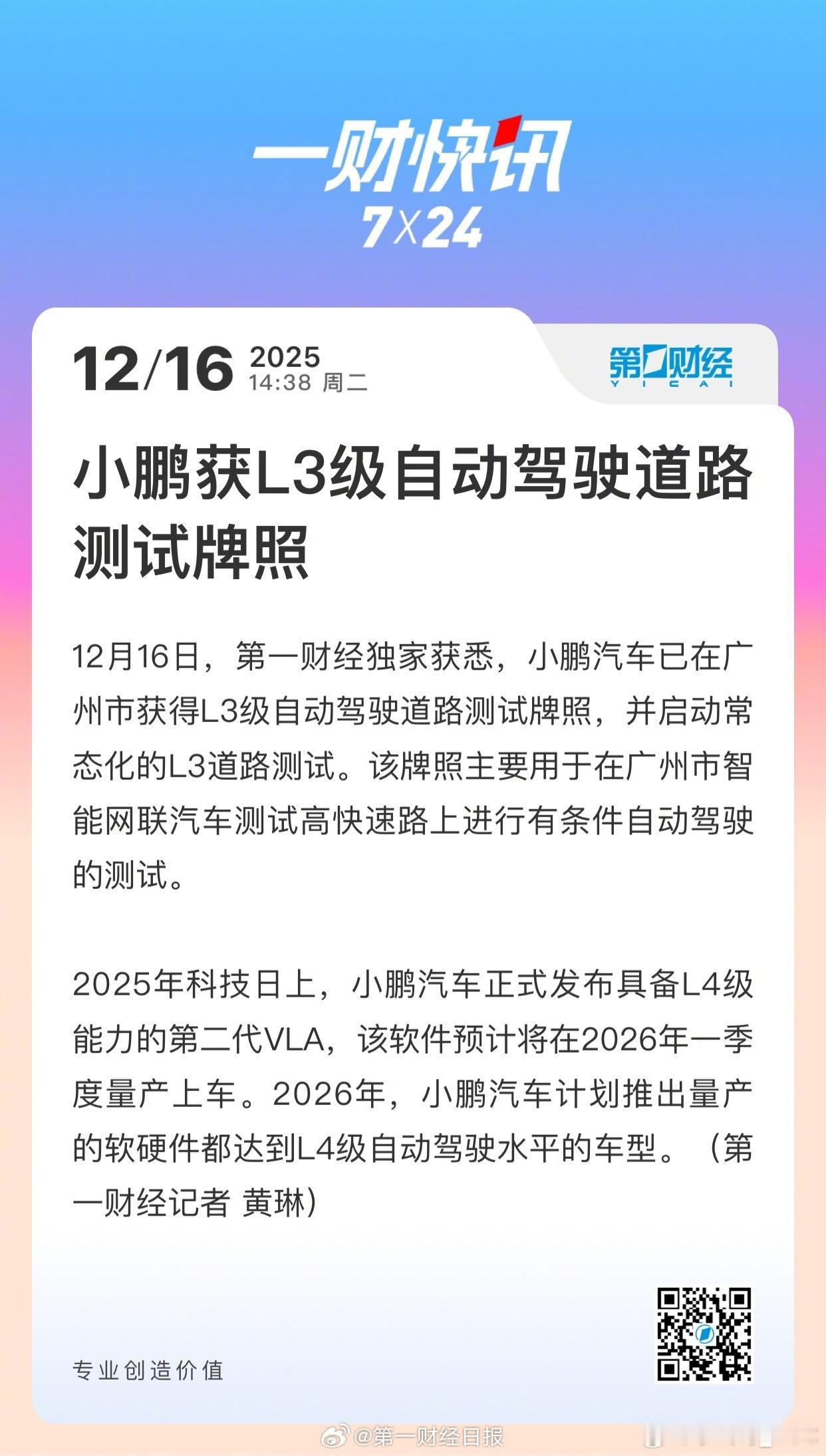 最近L3级自动驾驶消息密集啊小鹏获L3级自动驾驶道路测试牌照小鹏第二代VLA涌现自动识别手势场景小鹏汽车已在广州市获得L3级自动驾驶道路测试牌照,并启动常态化的L3道路测试小鹏已持有L3级自动驾驶测试牌照,但技术储备与演进目标已直指L4。2025年科技日上,小鹏汽车正式发布具备L4级能力的第二代VLA,该软件预计将在2026年一季度量产上车。