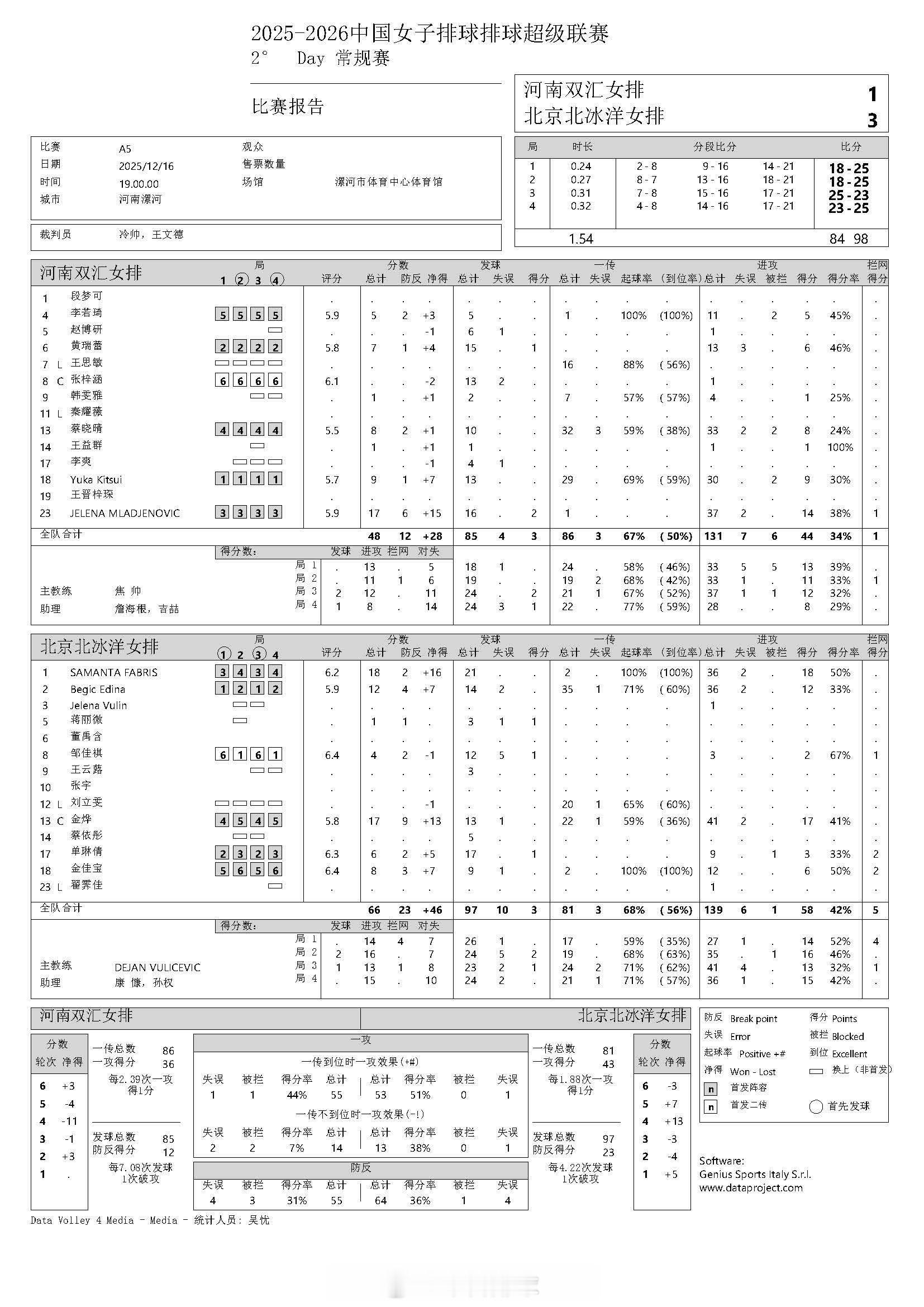 【中国女排超级联赛 常规赛:河南1-3北京得分统计】16日晚上,河南漯河,A级常规赛第2轮,河南双汇在主场以1-3(18-25, 18-25, 25-23, 23-25)不敌北京北冰洋。叶莱娜17分(37扣14中、拦1发2),橘井友香9分(30扣9中),蔡晓晴8分(33扣8中);法布里斯18分(36扣18中),金烨17分(41扣17中),贝吉奇12分(36扣12中),金佳宝8分。扣球44-58、拦网1-5、发球3-3、对手失误36-32。