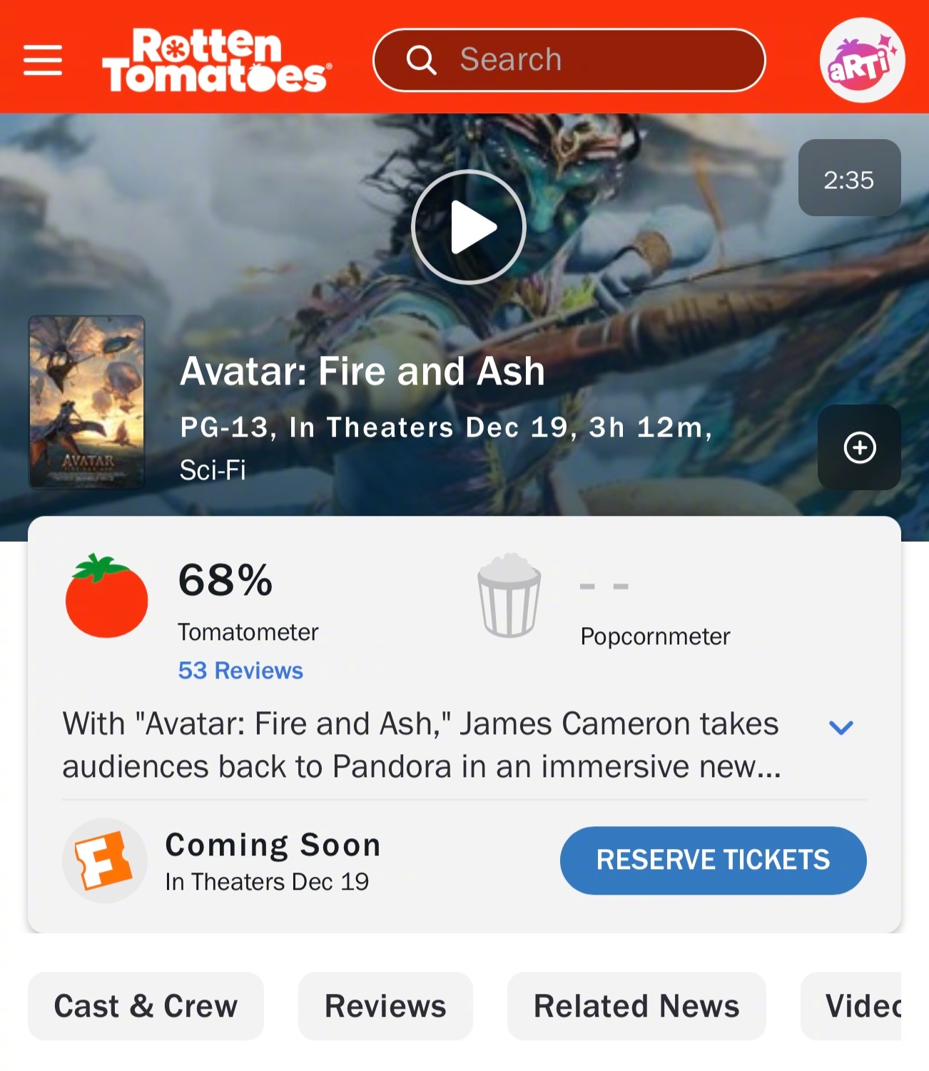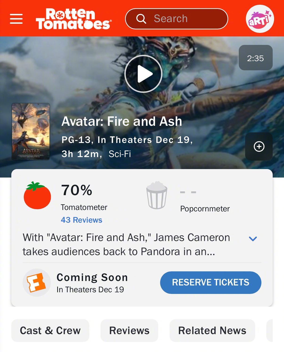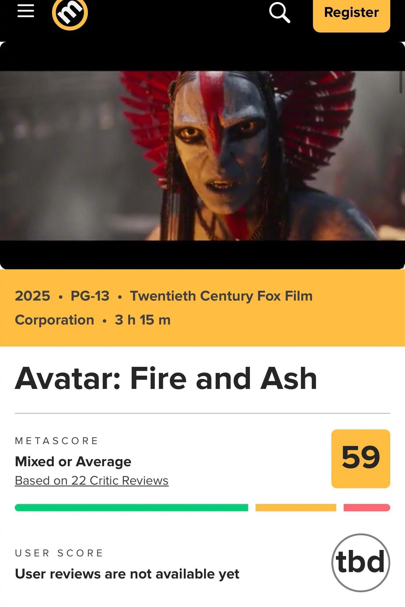 《阿凡达3》口碑解禁,烂番茄新鲜度从70%降至目前的68%,MTC评分59。阿凡达3