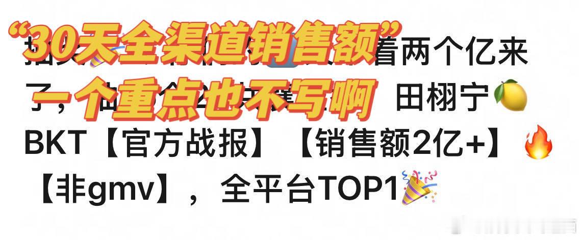 田栩宁全平台销售额破2亿❗热搜词条打假,请问是不是少写了几个字?❓粉丝吹的时候为什么不写“三十天、全平台全渠道”❓请问内娱哪家商务战报会出三十天全渠道全平台的,倒反天罡了,怎么不从BKT创办那天开始算起?全平台三十天这个店里还有好几个另一位代言人杨🍯的单链,昨天二次再贩新链接销量三万一个链接只卖出四千一个链接六千,根本不用限量,都没卖完,粉丝割不动了