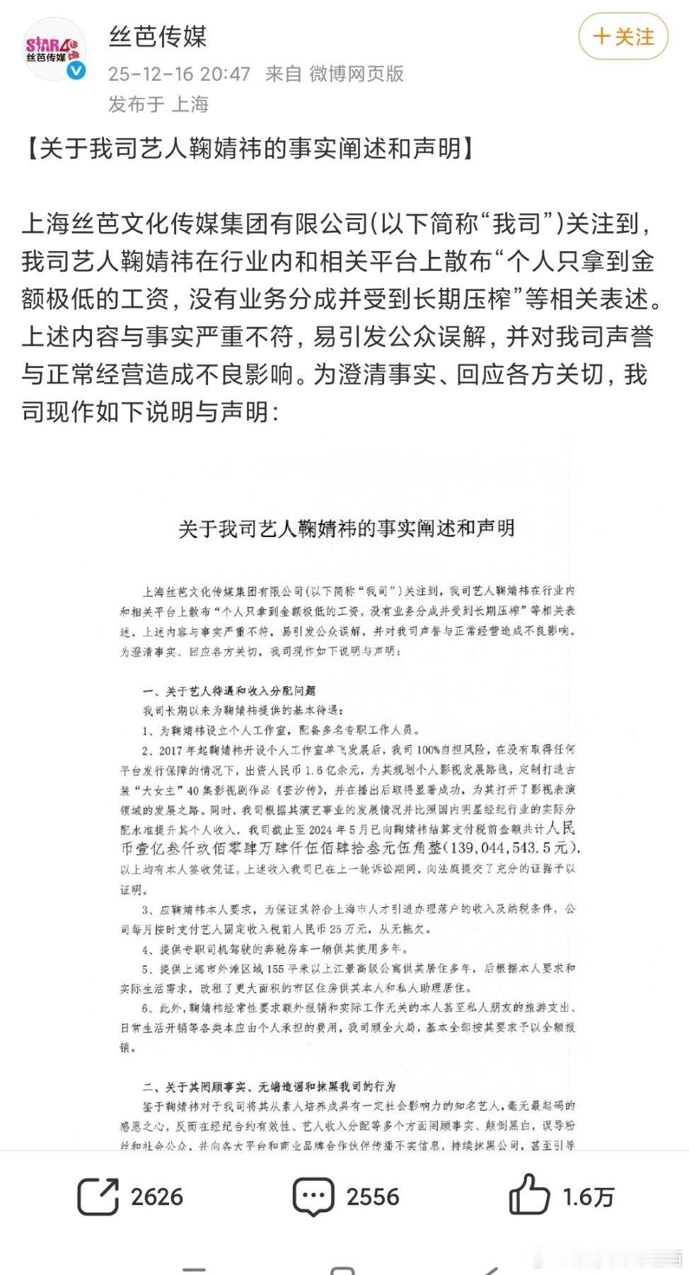 鞠婧祎方艾特丝芭 丝芭称已支付鞠婧祎超1.39亿鞠婧祎方称笔记鉴定无法判定为鞠婧祎本人签字;丝芭传媒方称给鞠婧祎打了1.39亿结算款,每月25万,专职司机奔驰房车。