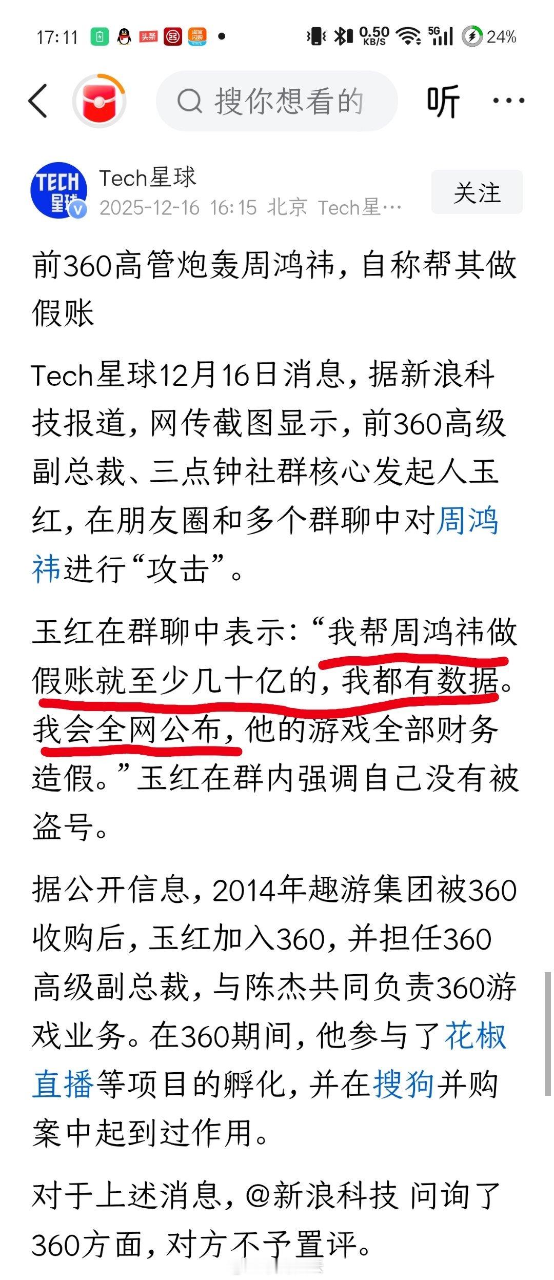 媒体报道:《前360高管炮轰周鸿祎,自称帮其做假账》周鸿祎声明前360高管炮轰周鸿祎周鸿祎回应被举报财务造假PS:这种涉及陈年旧事的,肯定不能只看一面之词,比如“做假账几十亿”的描述,过于夸张了,这种量级的账你能做得了假?当有关部门睁眼瞎?蹲一个360的严正声明或辟谣报警