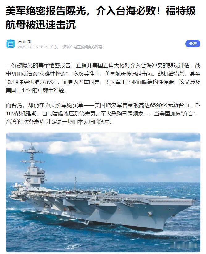 美军绝密报告曝光,事关中国台湾作战计划! 据媒体12月15日报道:美国五角大楼一份绝密报告被曝光了,这份本来是给白宫高层看的文件,一出来就把美军的老底揭穿了,想插手台海?纯属找死! 报告里写得明明白白,不管怎么模拟推演,美军一介入台海就得栽大跟头,最先进的福特级航母会被快速击沉,战机也会被一架架打下来,就算是短时间的冲突都扛不住。 更关键的是,美军背后的军火产业早就不行了,而台湾还在傻乎乎地给美国送钱买武器,最后肯定是竹篮打水一场空。 可能有人不信,觉得美军装备那么好怎么会输?这可不是瞎编的,是美国国防部自己反复推演的结果,他们国防部长都偷偷说过,台海相关的推演美军每次都输。 就说那艘花了130多亿美元的福特级航母,看着挺厉害,结果推演里每次都是刚上场就被击沉。 为啥这么不经打?咱们的东风导弹能从几千公里外精准打击,速度快到拦不住,多枚一起上,航母根本扛不住。再加上空中的巡航导弹和水下的潜艇,美军航母只要敢来第一岛链,就是活靶子。 就算有人觉得推演不算数,咱们看真实实力也能明白。20年前美国舰队还能在太平洋横着走,现在早就不行了。 咱们解放军有几百枚高超音速导弹,还有大量先进潜艇和战机,美军在太平洋的优势早就没了。 而且美军要是想派兵增援台海,咱们能在他们援兵到之前就把落脚点端了,他们自己都清楚,在台海根本没胜算。 美军没胜算,除了咱们解放军厉害,更重要的是他们自己的军火产业烂透了。现在美军造武器又贵又慢,一条F-35战机生产线一个月最多造6多架,还总缺零件停工。 2023年乌克兰打仗,美国连炮弹都供不上,得向韩国借。反观咱们中国,导弹、无人机这些武器能大批量生产,打仗到最后拼的就是产能,美国差远了。 最让人又气又心疼的是台湾,抱着美国大腿当救命稻草,疯狂砸钱买武器,结果被当成提款机。 台媒报道说,美国欠台湾的军售款都高达6590亿元新台币了。2019年订的66架F-16V战机,原定2023年交货,现在一架也没交。 自己造武器更丢人,花几百亿新台币、搞了十年的自制潜艇,海试时舵都转不动,只能靠士兵手动操作。 现在美国都看清介入台海必败,开始偷偷抛弃台湾了,可台湾当局还执迷不悟,继续砸钱买过期武器,这赌局注定血本无归。 说到底,美军介入台海必败是板上钉钉的事,报告、推演、军工烂摊子还有台湾的遭遇都能证明。台海是中国内政,外人插不了手。 台湾当局想靠美国撑腰搞台独,就是把台湾往火坑里推,最后坑的是台湾老百姓。大家都看得明明白白,美国靠不住,台独是死路一条,只有两岸和平发展,台湾才有未来。