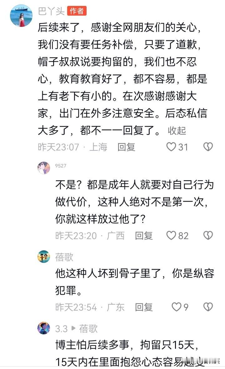 上海一男子车轮后放钉子后续,12月16日,上海一名男子在自己车旁边徘徊了一会,环顾了一下四周无人,将一颗钉子放在了另一辆车左前轮的后面。 钉子顶着左前轮轮胎,只要车子启动往后倒一下,轮胎就会被扎破,还好车主看到了这一幕,避免了自己的轮胎被扎。 随即,车主报了帽子叔叔,扎轮胎的男子也联系到了。 最后,车主说,没有要任何赔偿,只要了道歉,帽子叔叔说可以拘留的,但她不忍心,放过了准备扎她轮胎的男子。 很多网友说,车主纵容他人,但我觉得每个人都有犯错的时候,既然没有造成多大的损害,而且还诚恳地道歉了,能原谅就原谅吧!