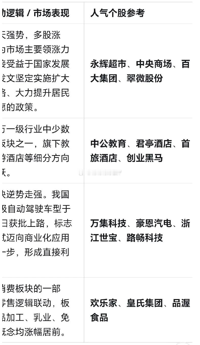明天周三核心潜力板块龙头!1. 商贸零售 核心驱动:国家发展改革委发文坚定实施扩大内需战略,大力提升居民消费意愿,直接提振了板块情绪。 个股参考:永辉超市、中央商场、百大集团、翠微股份。2. 社会服务 (含教育、旅游酒店) 核心驱动:社会服务作为申万一级行业中少数上涨的板块之一,旗下教育和旅游酒店细分方向表现活跃。 个股参考:中公教育、君亭酒店、首旅酒店、创业黑马。3. 智能驾驶 核心驱动:首批L3级自动驾驶车型于12月15日获批上路,标志着从测试迈向商业化应用的关键一步,形成直接利好。 个股参考:万集科技、豪恩汽电、浙江世宝、路畅科技。4. 食品饮料 核心驱动:作为大消费板块的一部分,与零售逻辑联动。 个股参考:欢乐家、皇氏集团、品渥食品(注:个股综合板块常规关注度列举,具体强势股可参考板块内涨停个股)。