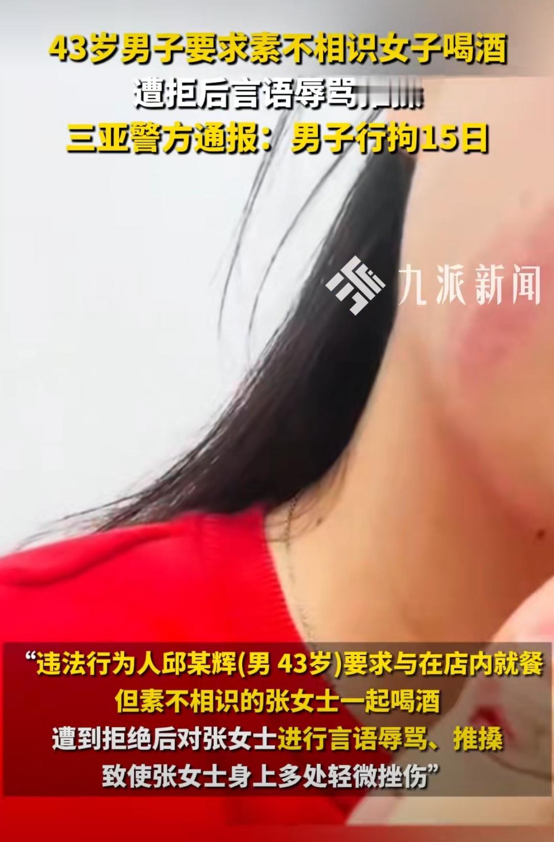 三亚男子夜宵店搭讪陌生女子遭拒,辱骂推搡致其受伤!警方顶格拘留15日! 凌晨的三亚夜宵店,本是食客休闲小聚的烟火之地,却因一名男子的霸道行径变了味。2025年12月16日凌晨,43岁男子邱某辉在三亚某夜宵店内,向素不相识的就餐女子张女士提出拼桌喝酒的要求,遭到明确拒绝后竟恼羞成怒,对张女士实施言语辱骂和肢体推搡,导致张女士身上多处出现轻微挫伤。 现场流传的视频显示,邱某辉被拒后态度十分嚣张,持续辱骂时长长达五分钟,期间完全无视周围食客的劝阻,言行极具挑衅性,恶劣行径让在场众人愤慨不已。受害的张女士事后回应称,虽然身体并无大碍,但男子的无端骚扰与暴力行为,给她造成了不小的心理困扰,始终坚信涉事男子会依法受到惩处。 事件发生后,三亚市公安局吉阳分局迅速介入调查。12月16日,警方发布官方通报,明确认定邱某辉的行为已构成寻衅滋事,依据《治安管理处罚法》第26条规定,对其作出行政拘留15日的顶格处罚。这一快速且严厉的处置,既给了受害者公道,也赢得了网友纷纷点赞,大家直呼“警方处置高效,零容忍态度太赞”。 很多人疑惑为何是顶格拘留?其实这一处罚完全有法可依。根据《治安管理处罚法》相关规定,随意殴打他人、追逐拦截辱骂他人的寻衅滋事行为,情节较轻的处5-10日拘留,情节较重的则处10-15日拘留。邱某辉在公共场所公然骚扰陌生女子,遭拒后持续辱骂推搡,无视他人意愿与公共秩序,恶劣影响远超一般寻衅滋事行为,顶格拘留是对其违法行为的精准追责。 这起事件也给所有人敲响警钟:拒绝陌生人的不合理要求,是每个公民的合法权利,无需有任何心理负担。无论是拒绝陌生搭讪、不合理求助,还是其他让人不适的要求,坚定说“不”都是在维护自身合法权益,任何人都无权以此为由进行报复或骚扰。同时,公共场所的安宁需要每个人共同守护,尊重他人边界、守住法律底线,才是文明社会应有的模样。 创作训练营2期开营啦男子搭讪遭拒殴打女子被拘15天 警方通报女子拒绝搭讪遭殴打