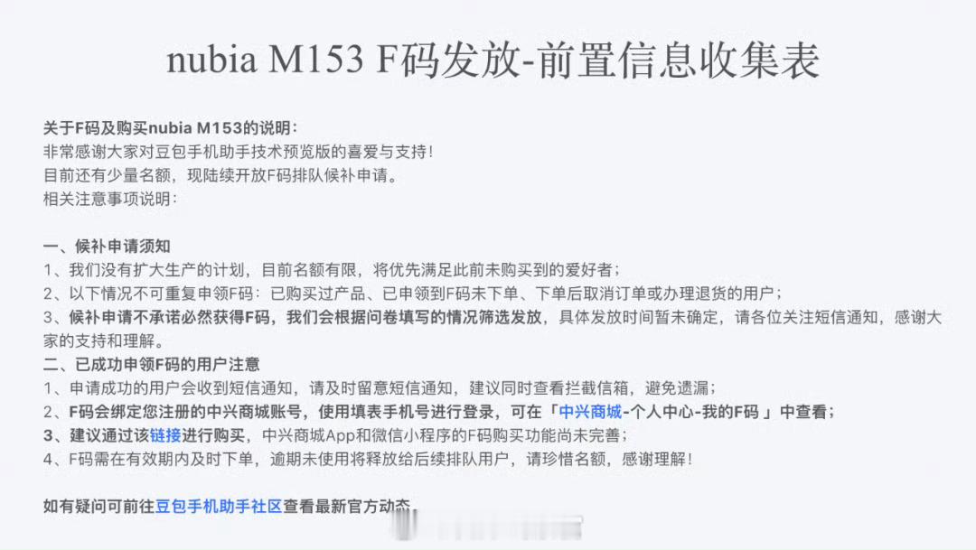 豆包 AI 手机恢复销售,重启 F 码候补申请通道。据 nubiaM153 F 码发放前置信息收集表显示,此次开放的为 F 码排队候补申请,仅有少量名额且无扩大生产计划,将优先面向此前未购买到该机型的爱好者。 豆包手机308_IO