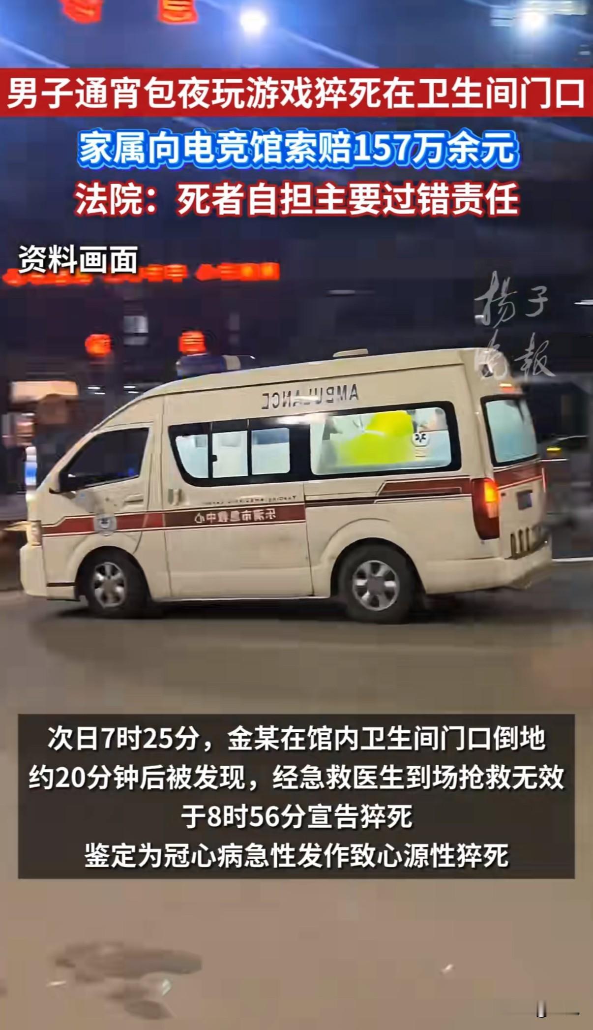 通宵包夜结束后,29岁的金某在电竞馆卫生间门口倒下,再没起来。屏幕上的游戏画面还在闪烁,但他永远掉线了。 那天晚上,金某和朋友小李走进电竞馆时,前台小哥头都没抬。“包夜?”嗯,包夜。”身份证刷了两下,两张临时卡递出来。晚上10点24分,金某把鼠标移到屏幕角落,点了“通宵模式”的选项。这个动作他做过无数次,轻车熟路。 键盘声噼里啪啦响了一夜。金某揉了揉发酸的眼睛,屏幕右下角显示早上7点23分。他推开椅子站起来,往卫生间走去。 监控画面显示,7点25分,他走到卫生间门口,突然踉跄了一下,双手在空中虚抓了一把,然后直挺挺地倒下去。后脑勺磕在地砖上,发出闷响。没人听见。 小李还在专注地操作着他的英雄,耳机里传来队友的喊声。他完全没注意到旁边机位已经空了。 7点40分,一个来上厕所的顾客发现了倒在地上的金某。“喂!醒醒!”那人蹲下推了推,没反应,赶紧跑回大厅喊人。 前台小哥慢悠悠走过来,蹲下看了看,脸色变了。“打120!快!” 7点47分,电话接通。“这里有个人晕倒了,叫不醒……”小哥描述地址时声音有点抖。 急救人员赶到时,金某的身体已经凉了。抢救动作只是程序性的,有经验的医生看一眼就知道,来不及了。 尸检报告是半个月后出来的。冠状动脉严重狭窄,高血压,脂肪肝。法医的结论很专业:冠心病急性发作致心源性猝死。 家属接到通知时,母亲当场晕了过去。父亲抓着报告单,手抖得纸页哗哗响。“我儿子平时好好的……” 他们找了律师,起诉状写得密密麻麻。电竞馆违规通宵营业,没有及时救助,没有安全巡查……总计157万余元,每一个数字都沉甸甸的。 法庭上,电竞馆老板杜某声音很大:“他自己有病,还来通宵,怪我们?”律师在一旁补充:“我们提供了消费环境,但不是保姆。” 法官问:“你们营业时间到几点?”杜某顿了顿:“按规定是到12点。”那实际呢?”杜某不说话了。 监控被反复播放。金某倒地的瞬间,大厅里无人察觉的画面。7点25分倒地,7点40分被发现的时间差,在屏幕上冷冷地显示着。 “15分钟。”原告律师强调,“心源性猝死黄金抢救时间只有4分钟。” 电竞馆的律师反驳:“我们不是医疗机构,无法预见他什么时候发病。” 但法官注意到一个细节:金某切换通宵模式时,系统没有任何健康提示。整个夜班期间,没有工作人员巡查提醒。 判决书下来了,80%和20%的责任划分。157.5万总损失,电竞馆承担31.5万。双方都上诉了,觉得不公平。 二审法庭上,金某母亲哭得说不出话。杜某反复说:“小本生意,赔不起这么多。” 法官最后敲下法槌:“维持原判。” 走出法院时,杜某点了根烟,手有点抖。金某父亲看着判决书,31.5万的数字旁边,是儿子再也回不来的事实。 那天晚上,那家电竞馆依然亮着灯。通宵模式的选项还在屏幕角落,等着下一个点击它的人。
