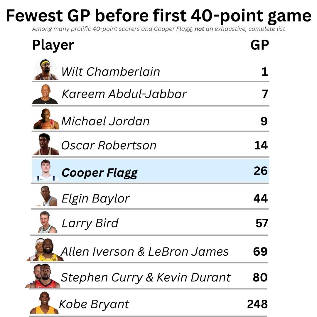 首次砍下40+得分所需最少场次: 球员 场次 威尔特·张伯伦 1 卡里姆·阿卜杜尔-贾巴尔 7 迈克尔·乔丹 9 奥斯卡·罗伯特森 14 库珀·弗拉格 26 (本赛季新秀状元) 埃尔金·贝勒 44 拉里·伯德 57 阿伦·艾弗森 & 勒布朗·詹姆斯 69 斯蒂芬·库里 & 凯文·杜兰特 80 科比·布莱恩特 248 张大帅果然名不虚传,科比有点多了! 球星得分排名 张伯伦 新秀得分王 威尔斯队史球星 詹姆斯与乔丹,谁更厉害?
