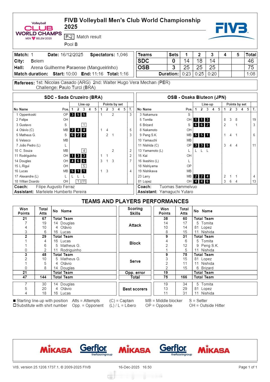 【男排世俱杯大阪完胜克鲁塞罗取开门红 彭世坤7分】中国排球留洋动态国际排坛战报速递12月16日巴西贝伦,2025男排世俱杯揭幕战,B组日本大阪布鲁顿3-0(25-14/25-18/25-14)完胜巴西克鲁塞罗,取得开门红。富田将马19分、洛佩兹13分、西田有志11分、彭世坤7分(5扣4中2拦1发),道格拉斯得到克鲁塞罗最高的7分。