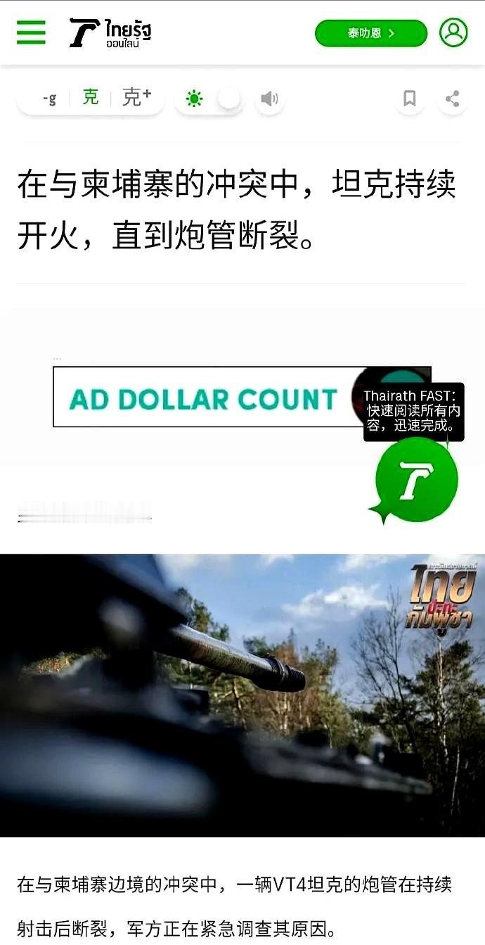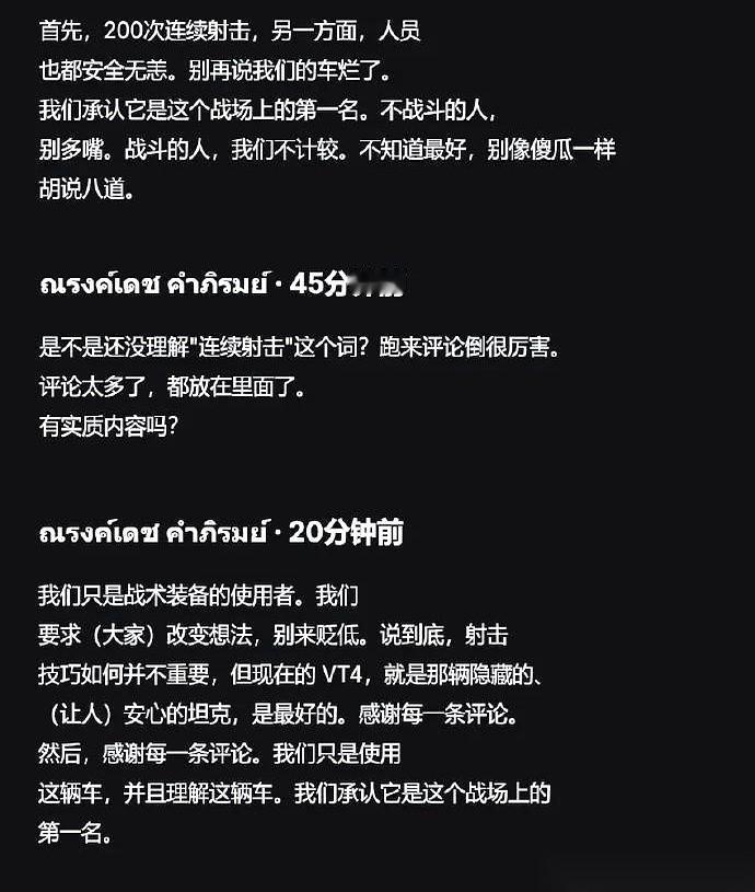 炮管子炸了。 跟个大号炮仗似的,在战场上直接开花。咱们的VT-4坦克,在泰国。 网上瞬间就炸了锅,各种冷嘲热讽,说“中国制造”不行了。 结果呢? 人家泰国坦克手自己站出来了,一句话把所有人的脸都抽肿了。 他说,我们连续打了200多发炮弹。两!百!多!发! 大哥,你这是把坦克当加特林在使啊?说明书是让你垫桌脚了吗?这是什么魔鬼用法? 但最牛逼、最核心、最让我一下子就想通了的是什么? 是炮管炸了,里面的人,毫发无伤。 车组乘员,一个都没事,安然无恙地爬出来了。 这才是顶级工业品的终极哲学啊! 装备,是为人服务的。关键时刻,铁疙瘩可以坏,但里面我辛辛苦苦培养的兵,我活生生的人,必须给我保住! 所以你看,外行看热闹,吵着说“你看它坏了”。 内行和用户自己呢?人家心里跟明镜似的,亲自出来点赞:这质量太顶了,人没事,就是最好的证明! 这事儿说白了,就是把一辆家用车开到F1赛道上跑了三百圈,最后发动机爆缸了,你回头骂车不行? 离谱的是,车手还爬出来给你比个大拇指说:哥们儿,这车真结实!
