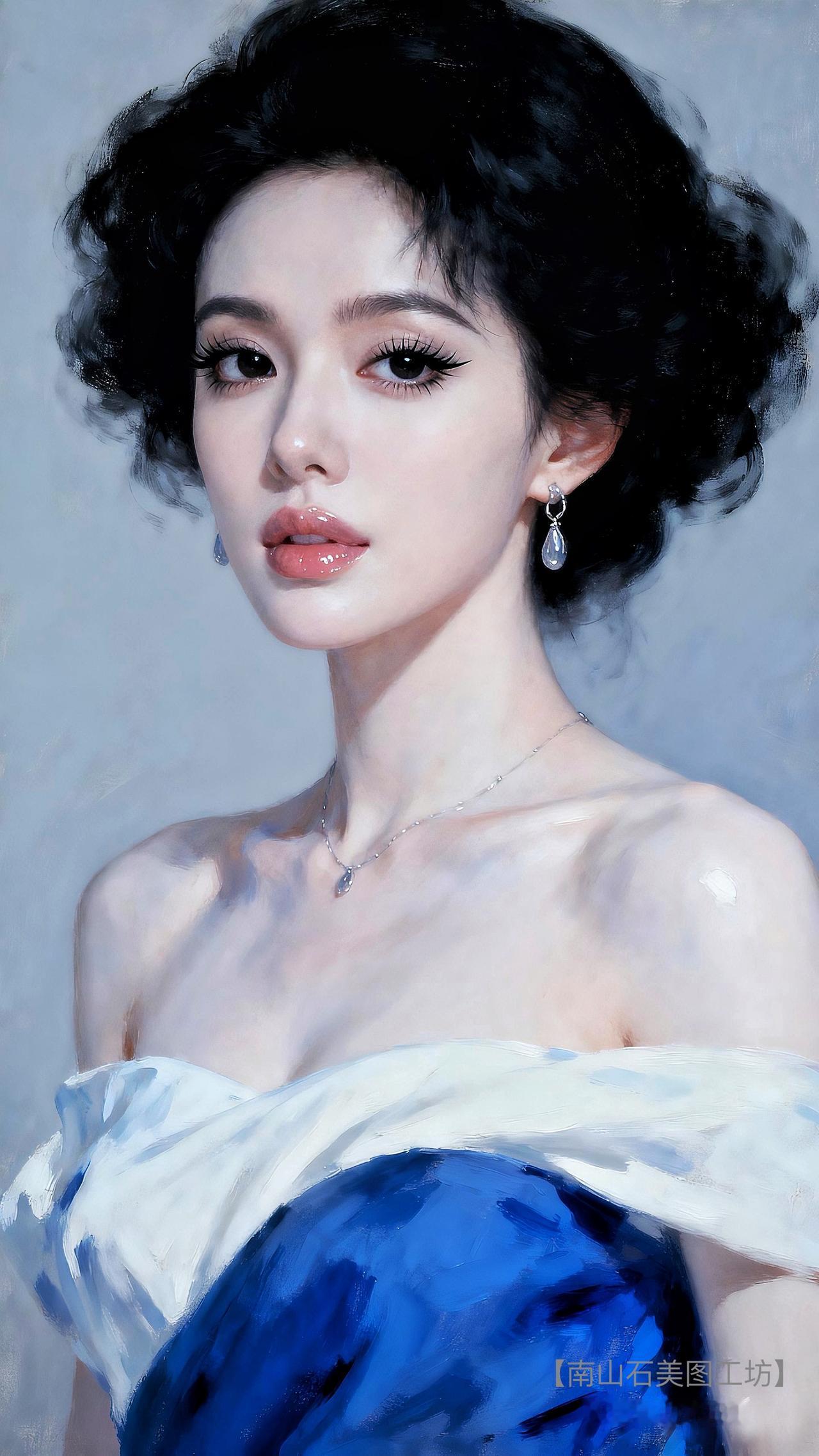 墨色卷发扬着艺术韵律,蓝白礼裙晕开优雅光晕,水滴珠宝缀满星芒。她眼藏星海,肤若霜雪,每寸轮廓都淌着贵气,仿若从画中走来的缪斯,一眼便让心跳为美折服。
