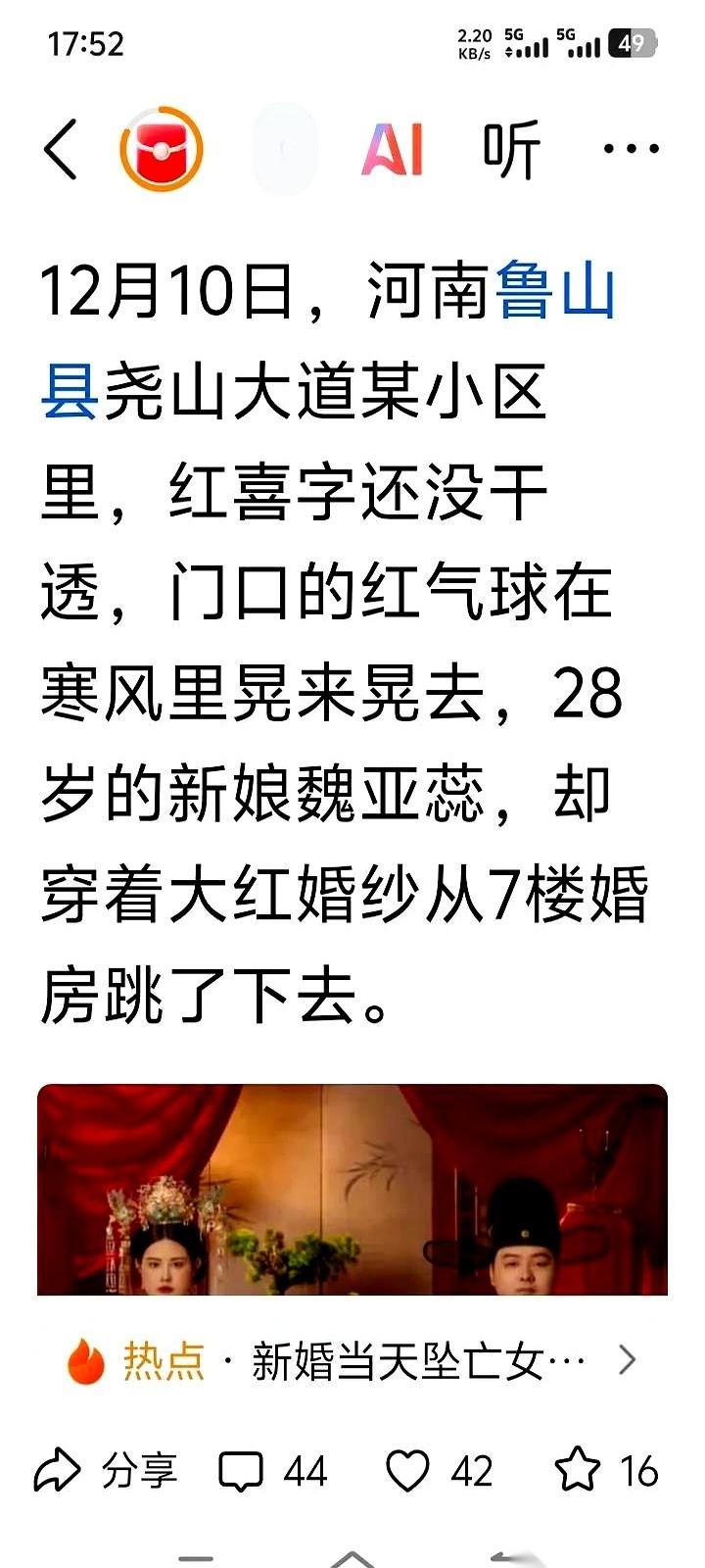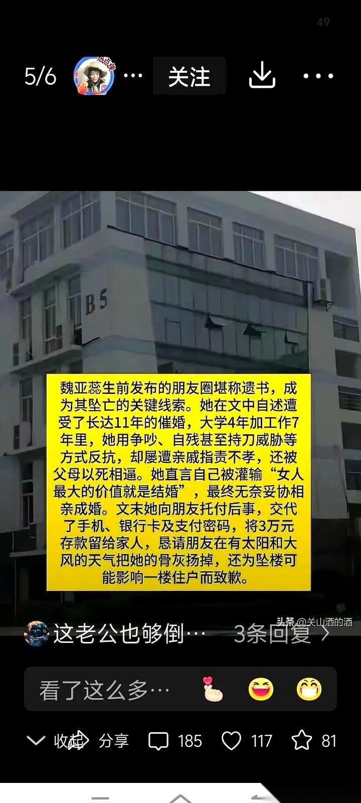 她穿着婚纱,从7楼的婚房,跳了下去。 就在她结婚的当天。 用一种最决绝的方式,结束了这场她根本不想要的“喜事”。 整整11年啊。从大学毕业到当上老师,她爸妈每天都在催她结婚,催到后来直接拿死来逼她。 “你要是不结婚,我们就死给你看!” 她也反抗过,拿刀对着自己,自残,用尽了所有力气说“不”。 但没用。 在“孝顺”这座大山面前,在亲戚朋友“都是为你好”的唾沫星子里,她所有的挣扎,都像个笑话。 最后,她“听话”了。 恋爱,订婚,拍婚纱照,装修婚房。 她一步步扮演着那个“乖女儿”,直到婚礼当天,她用生命,完成了最后一次反抗。 他们赢了面子,把女儿逼到了婚礼上。 而她,用自己的方式,亲手结束了这场名为“爱”的战争。 最扎心的是什么你知道吗? 她的遗书里,留下了银行卡密码,把钱都给了父母。 甚至,还给一楼被她吓到的邻居,道了歉。 她对所有人都很抱歉,唯独没有机会跟自己说一句: “对不起,这么多年,委屈你了。” 她最后的愿望是,把骨灰撒向天空。 你看,她这一生都在被安排,被捆绑,到头来,想要的不过是一点点,哪怕是死后的自由。