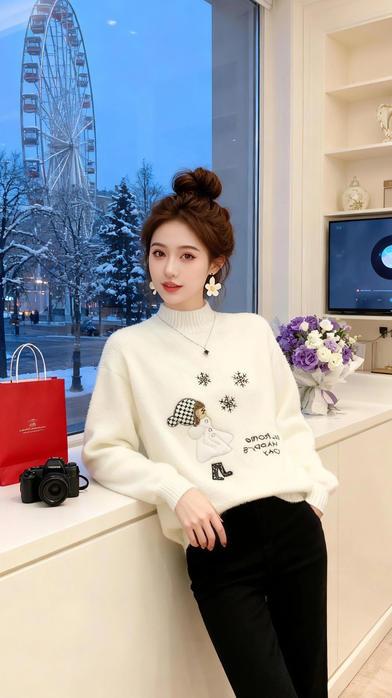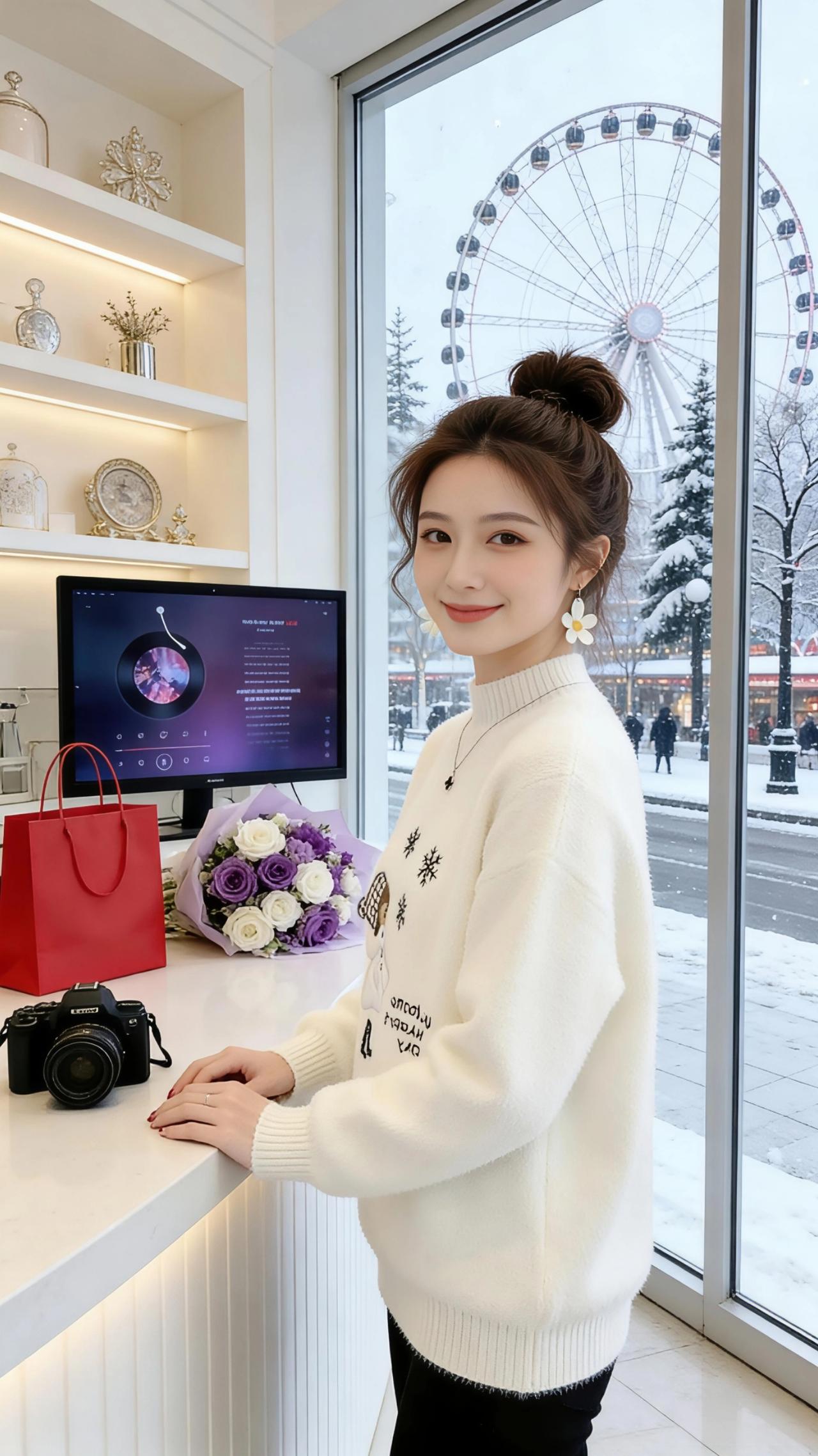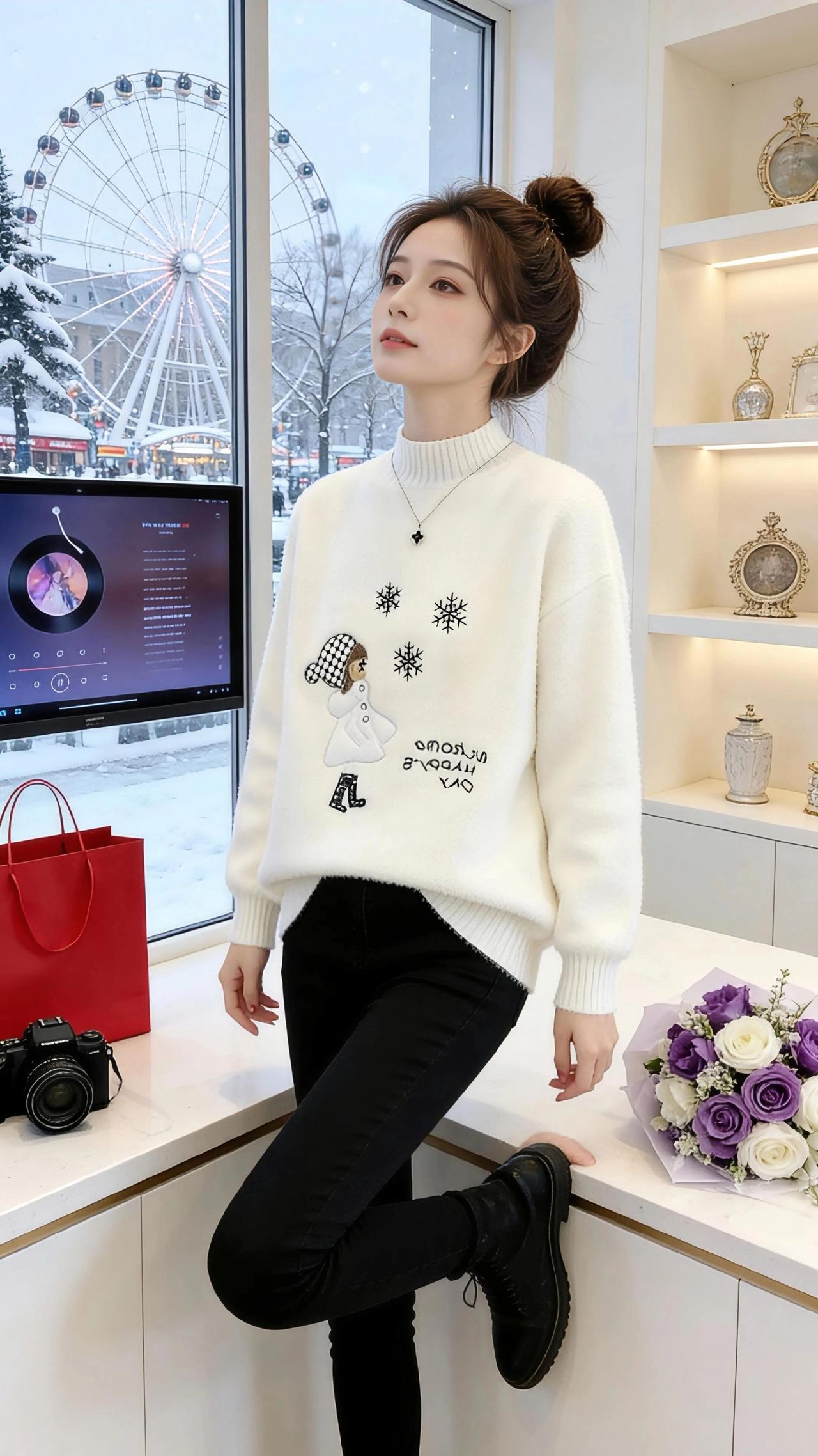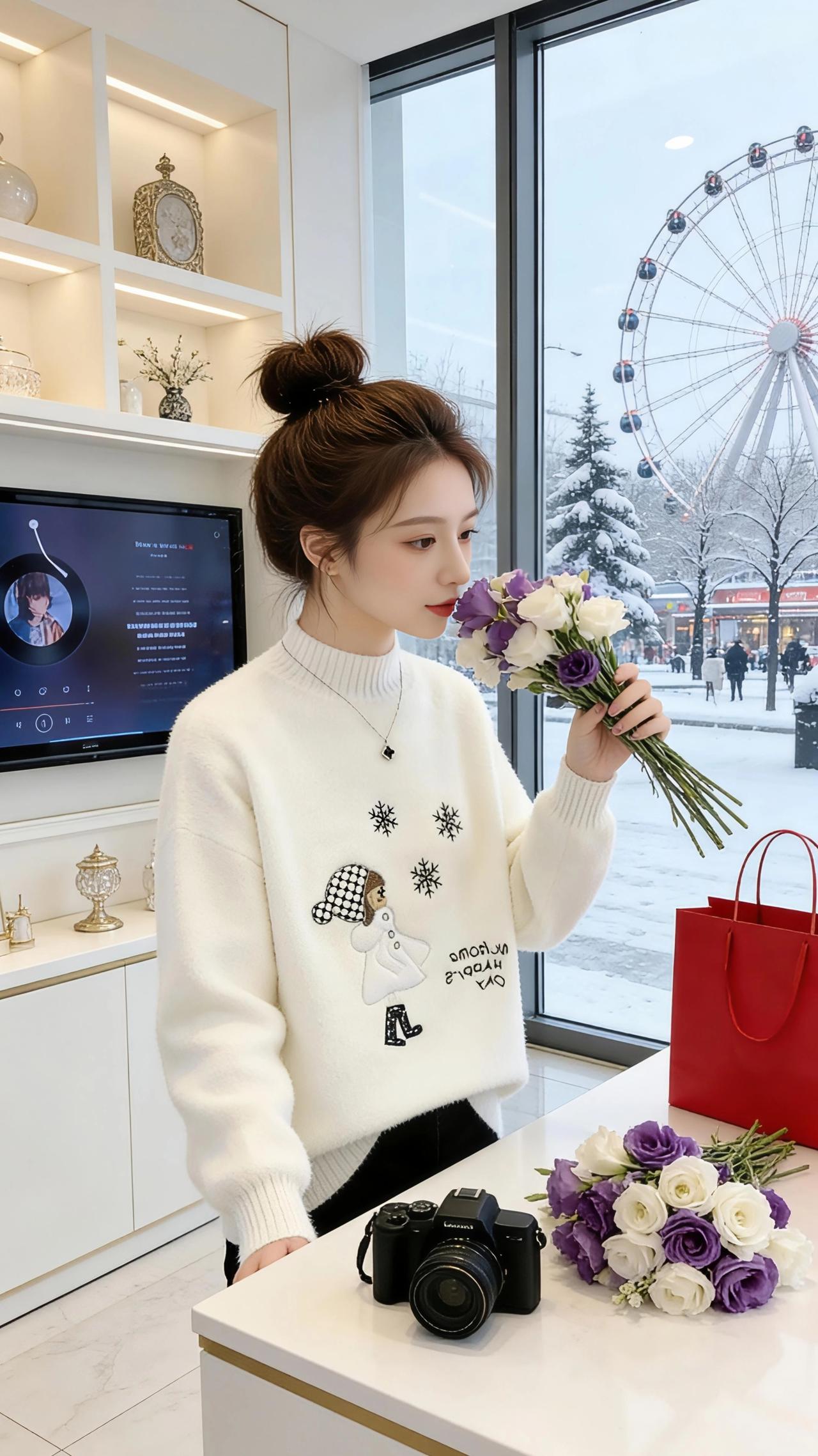 雪窗畔的温柔序章 冬日的风卷着细雪掠过落地窗,将摩天轮的轮廓晕染在澄澈的玻璃上,像揉碎了一捧银箔撒在城市的眉眼间。我倚在米白色的柜台边,指尖轻触过相机冰凉的机身,绒面毛衣上的雪花刺绣,竟与窗外飘飞的雪絮遥遥应和。 紫白玫瑰的甜香绕着腕间,红色购物袋的缎带垂落,像一截跳脱的火苗,在素净的冬日里撞出暖意。投屏里的旋律轻轻淌着,音符裹着暖气漫过置物架上的琉璃摆件,那些精致的瓶罐与钟表,都在暖光里漾着柔和的光晕,似把时光也揉得绵软。 我捻起一束花凑近鼻尖,花瓣上仿佛还沾着街角的雪气,却又被室内的温煦烘出温柔的弧度。丸子头的发梢蹭过耳畔,回头时,窗外的摩天轮缓缓转动,落雪的枝桠在它身旁轻轻摇晃,像在为这冬日里的小美好,打着温柔的节拍。原来冬日从不是冷寂的注脚,当暖室藏着花香,窗外飘着雪,平凡的瞬间也能酿成一首温柔的短诗。 高级感穿搭 小个子穿搭 时尚百搭针织衫 打底衫 这个冬天温度风度我都要 @DOU+小助手 @上热门🔥