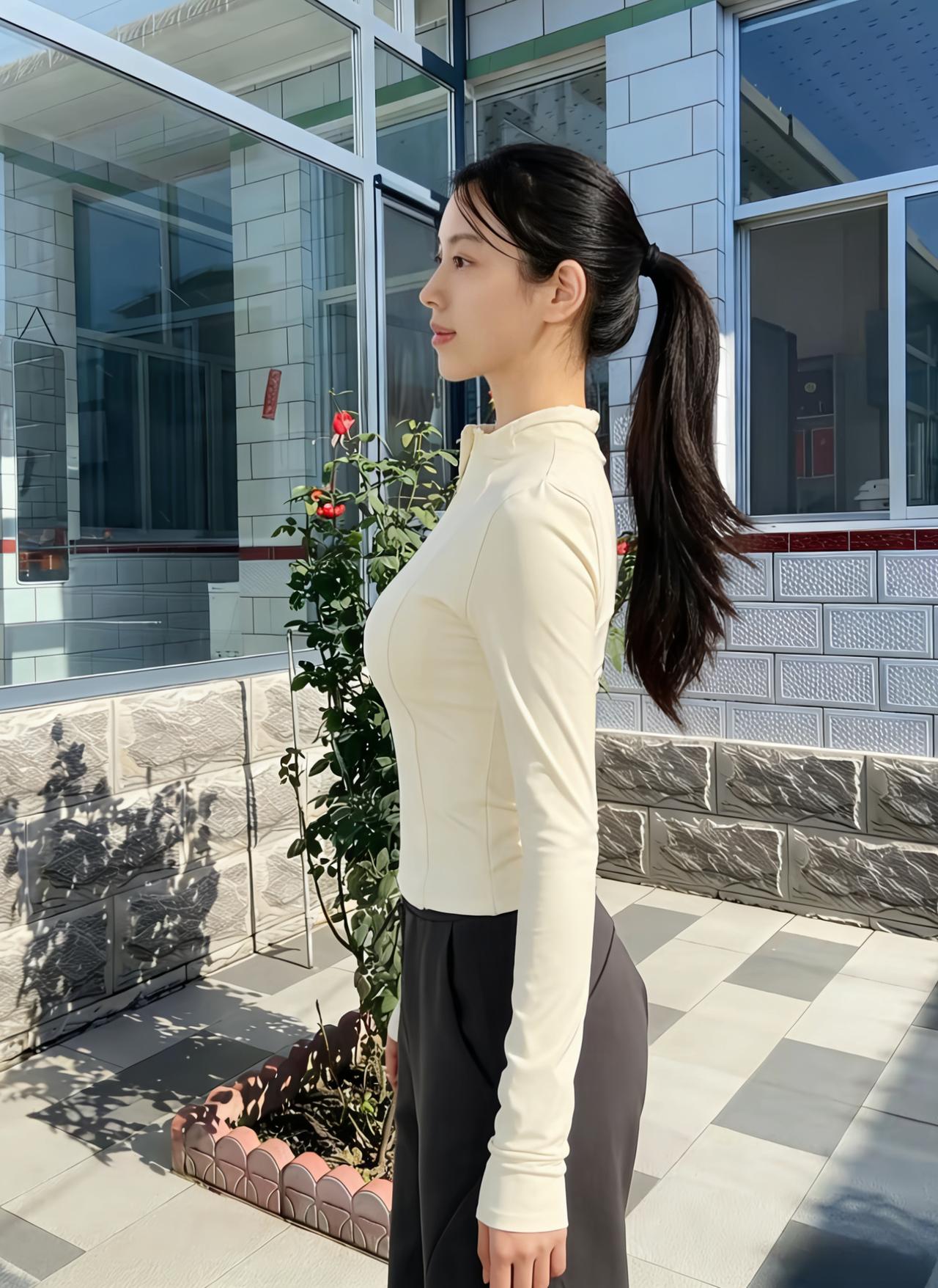 晨光斜切过墙面 在瓷砖上投下菱形的影 她站在光影里 米白上衣绷着肩线,像拉满的弦 ~ 马尾辫甩在身后 发梢扫过石墙的纹路 像墨线划过青石,利落干脆 ~ 砖墙上的红纹是界 隔开灰与白,冷与暖 她的侧脸对着光 鼻梁的弧度,是晨光吻过的痕 ~ 身旁的花株擎着红朵 是绿丛里一点烈的红 与她的素衣,撞出温柔的对比 ~ 空气里飘着晨露的凉 她的身姿是直的 像一株白杨,在市井的院落里 站成了自己的风景