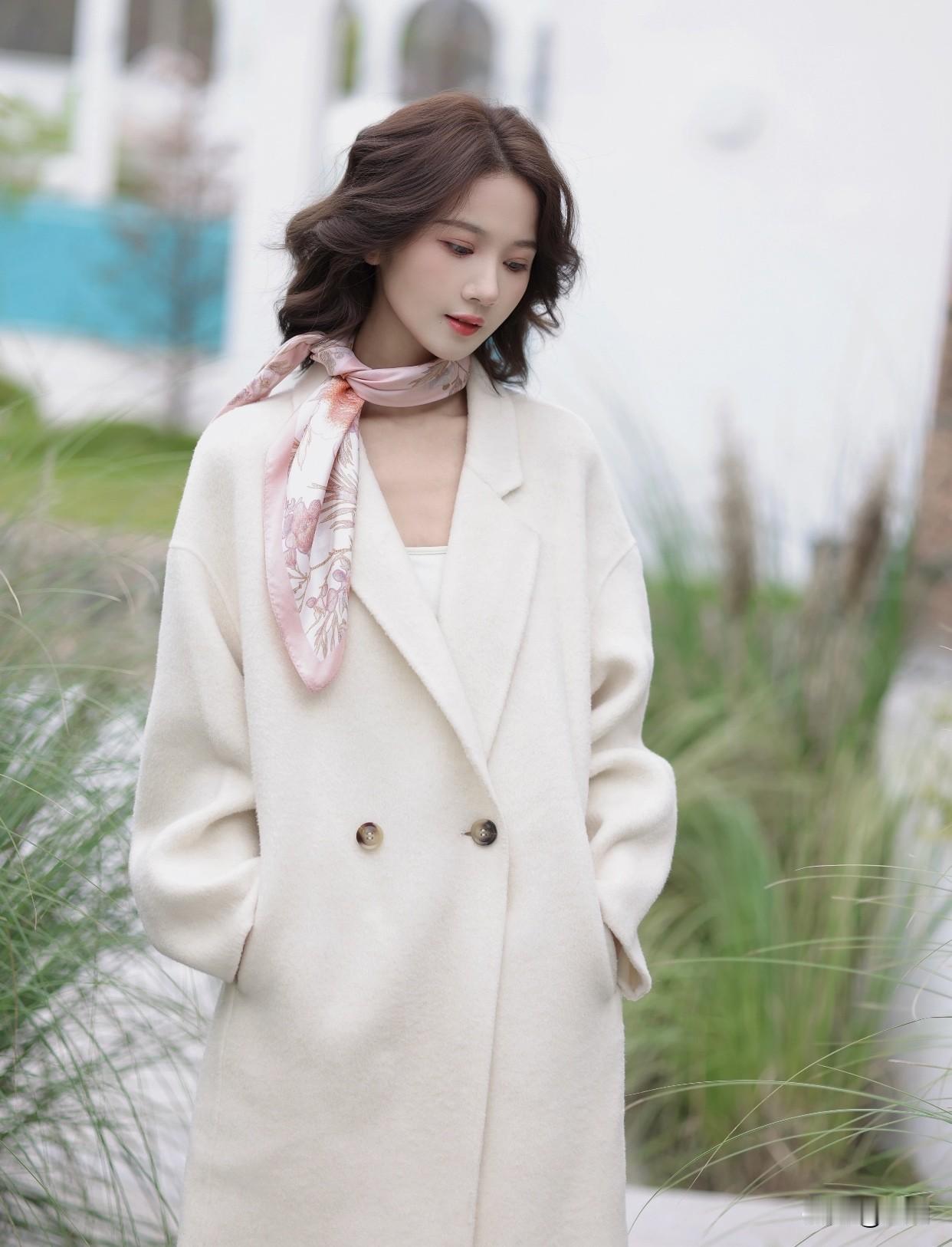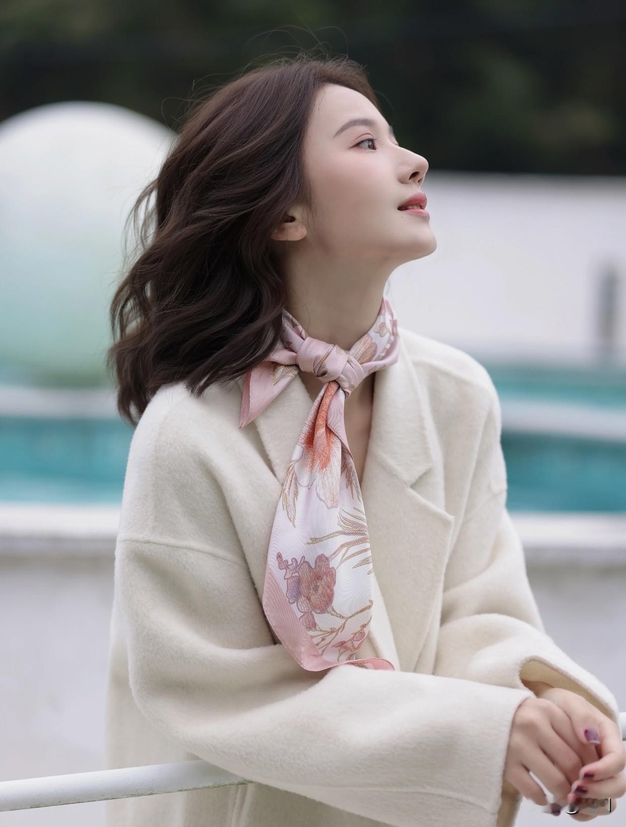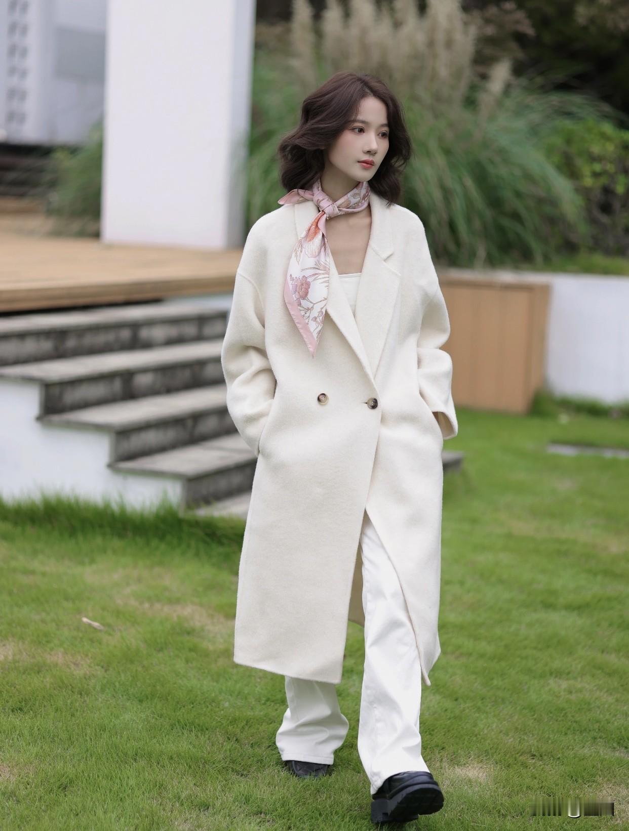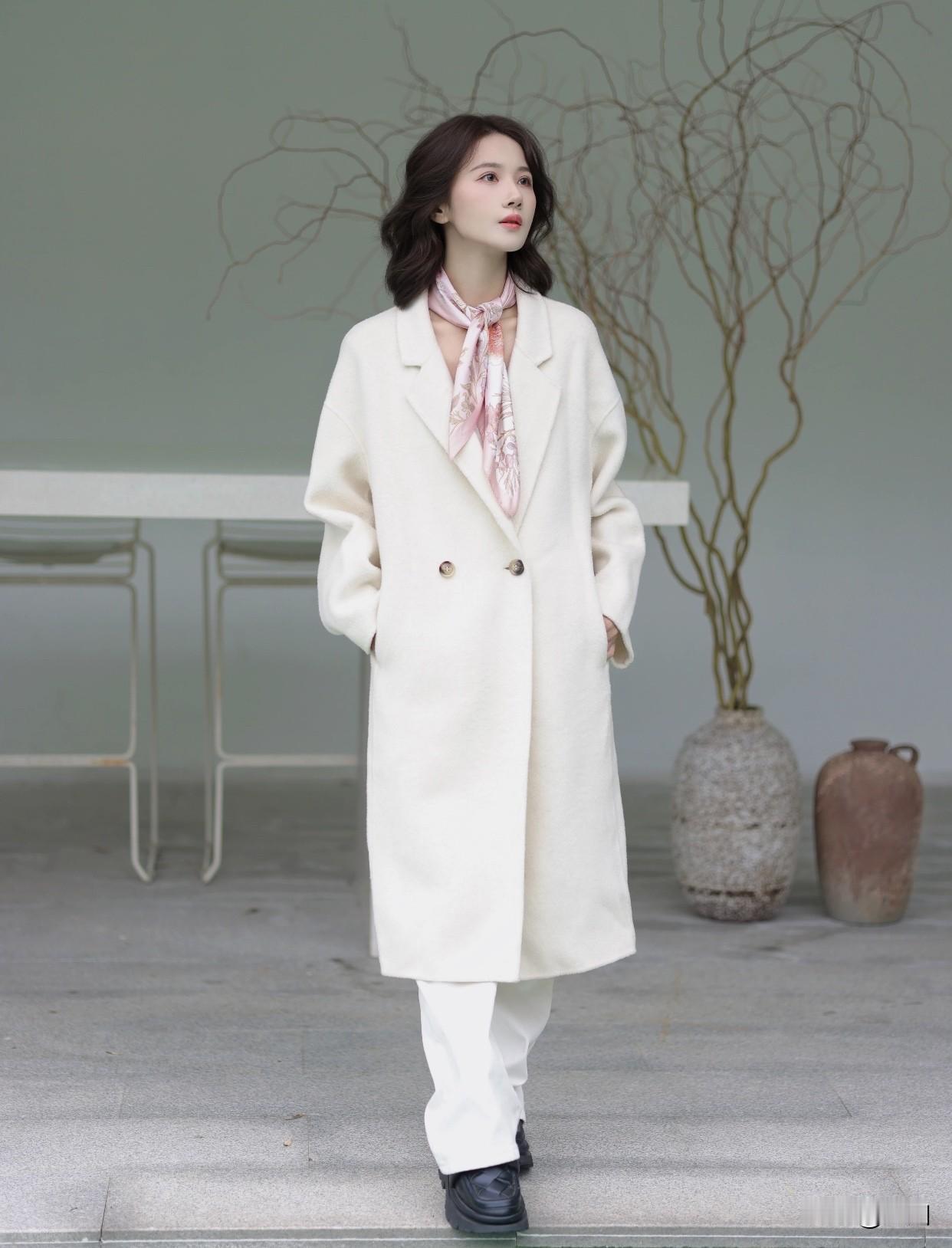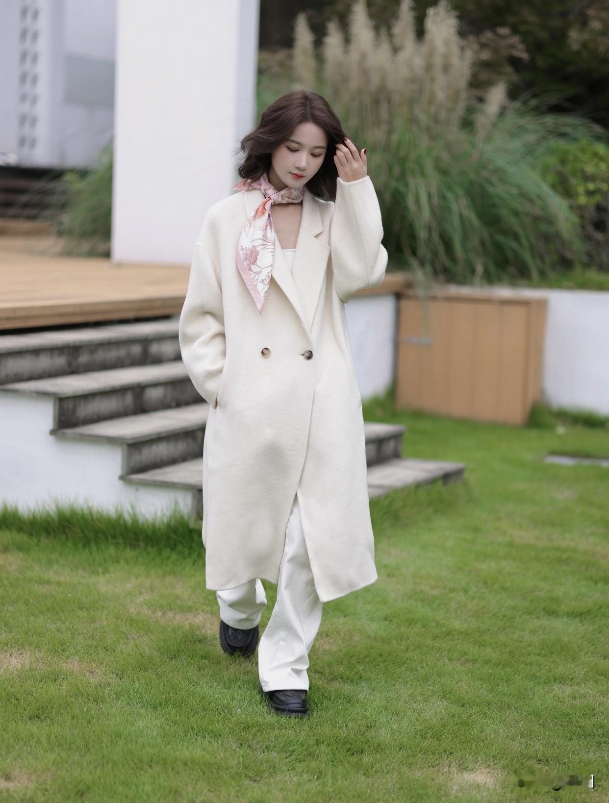 不过白色难驾驭,很容易穿“土”。大衣别选起毛起球、易褶皱的,选有垂感的羊毛混纺。白裤子不能太透、太紧身,直筒或微阔腿就不错,留量1 - 2指。 搭配时,避免纯白一身没层次,用“奶白/米白 + 驼/咖/灰”配色。再用丝巾点缀,系在领口或脖间,瞬间时髦度拉满,通勤、出街都合适。