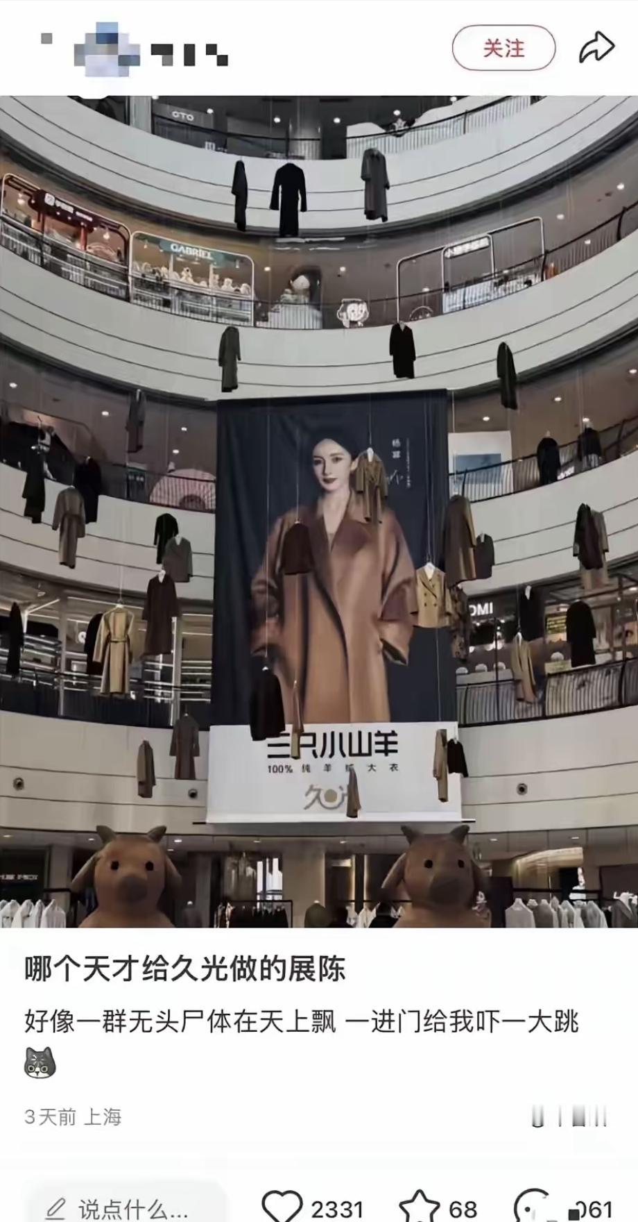 最近上海静安久光百货中庭摆了个奇怪的服装展。几十件大衣全挂在空中,高低参差不齐,中间还挂着杨幂的海报。顾客一进商场就看见这阵势,马上有人觉得衣服挂得像乱葬岗,纷纷投诉。一件衣服标价上万,可挂出来看着像是垃圾堆,买的人自然少了。 商场接到不少抱怨,后来把衣服重新摆整齐了。品牌方可能是想用新奇摆设吸引眼球,结果弄巧成拙。设计师或许压根没想到这种挂法会让人生厌。现在网上都在讨论商家到底懂不懂市场,也不知道这品牌下次还能不能搞好活动。