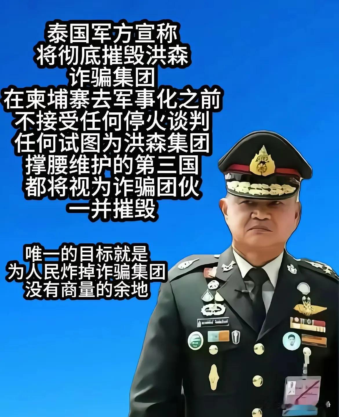 洪森父子麻烦了。现在泰国已将其家族列为诈骗集团,誓言摧毁之。 战争性质具有了国际正义性质。 公布的战果显示摧毁了柬埔寨赌场丶电诈园丶人体器官移植中心51个,大批电诈分子仓皇逃跑。 泰国军方还表示要摧毁東埔寨军事能力,而军事队伍是洪森父子的家底。