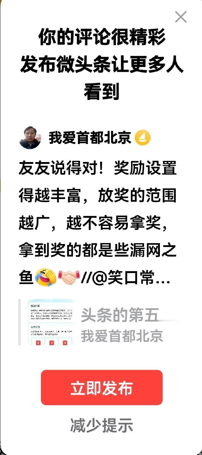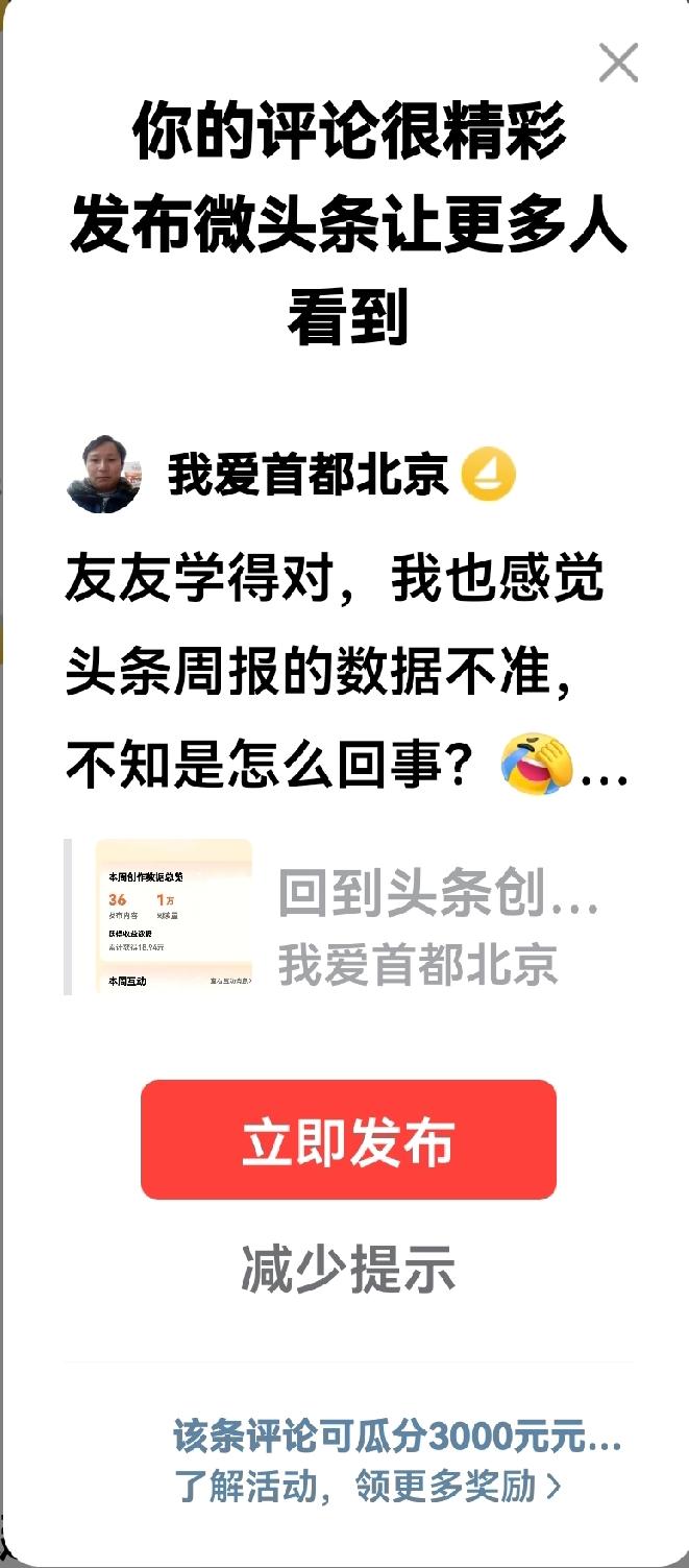 今天早晨回复了三条评论,三条评论都惊动了头条,共震率达到了100%。 头条说,你的评论很精彩,建议发布到微头条,让更多的人看到。 头条的建议我没有采纳,因为像这样的情况我经常遇到,以前发布过,但是无人问津,既得不到展现量,又无法获得阅读量,更不用说有点赞量与评论量了。 其实就一条评论,一个按钮,转发到微头条又不费劲,一个蜻蜓点水的动作就完成了,所以我倒不是特别在意有多少阅读量,有多少点赞!因为毕竟没有付出多少劳动,我是担心另一件事。 头条的创作讲究垂直度,创作领域不垂直,会影响到账号的权重,降低账号的价值,而我又正好是一个兢兢业业的创作者,为了不影响自己账号的信誉值,头条推荐的精彩评论我是一条也不会转发为微头条的,因为其内容基本上与自己的创作领域不垂直。 虽然头条判定的精彩评论我不会转发,但是这样的精彩弹窗我真的好喜欢!它就像每当我完成了作业,老师在后面打个“✓”、再在旁边写个“优”一样,那种被认可的幸福感、比吃了蜜糖还要甜。 现在形成了一个习惯,我的每一条评论都非常用心,就像我打磨一篇作品一样,评论发布后,我就期待弹窗的闪现,幸运的是我的每次期待,我的这个老朋友都不会令我失望! 我现在还有另一个期待,可能是人不知足吧,我希望我打磨的微文作品发布后也像我的评论一样被头条肯定。[捂脸]