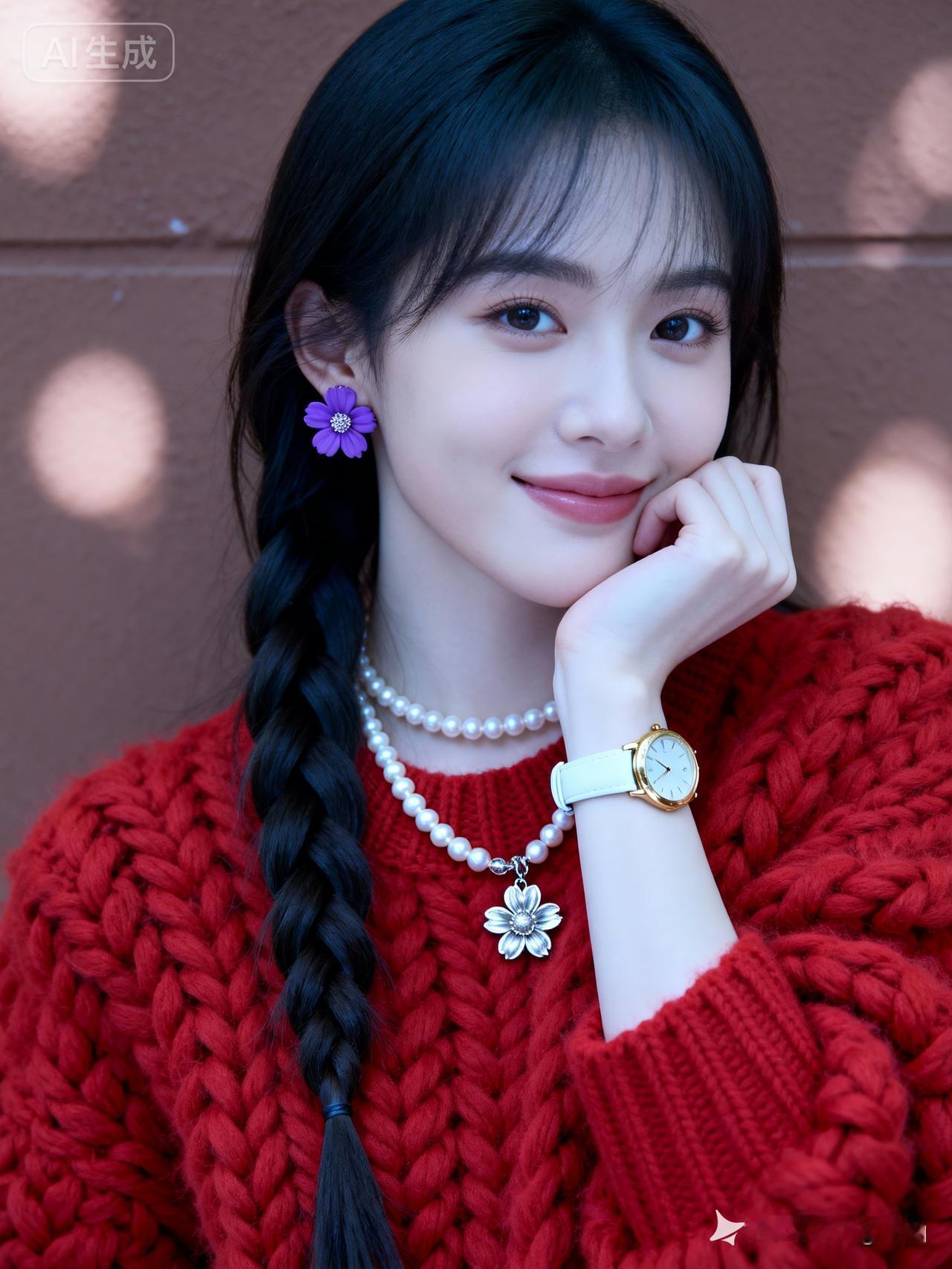 冬日暖阳下的甜美少女,红毛衣与珍珠项链的完美搭配,尽显温柔与优雅。
