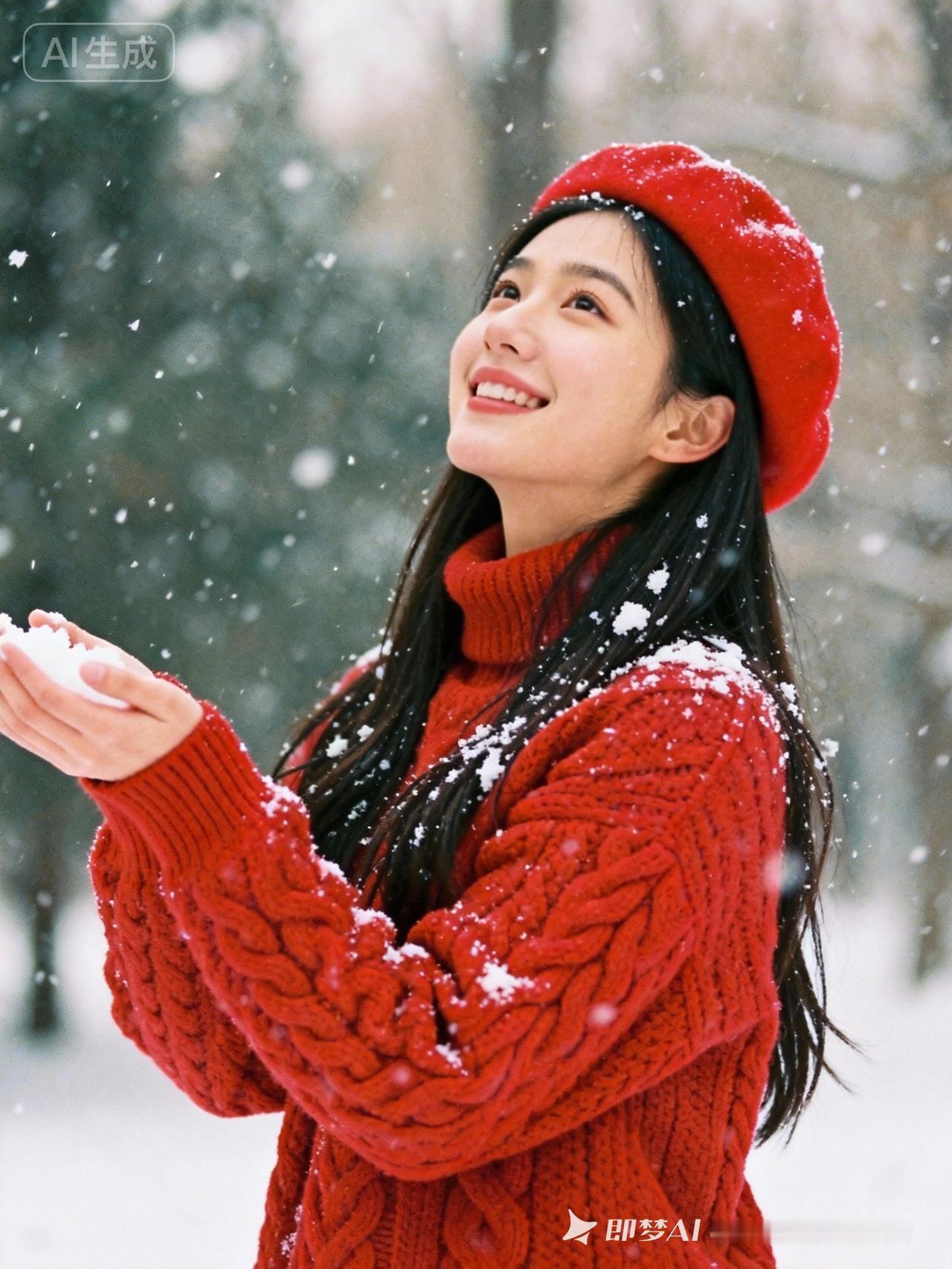 冬日暖阳下,红衣少女与雪花共舞,幸福满满。