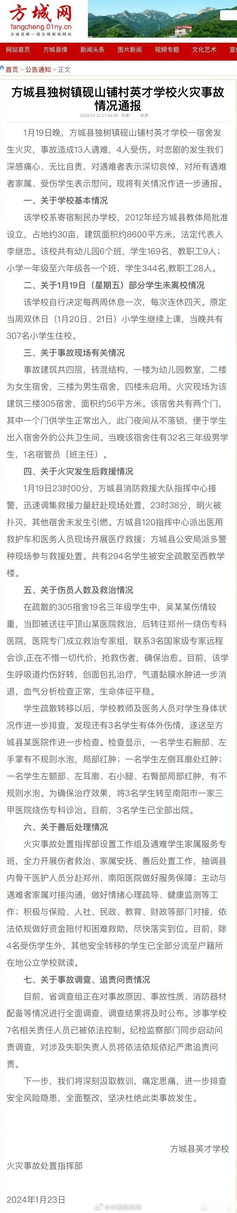 河南通报方城学校火灾事故调查结果25名责任人员被处理处。图二是之前的通报。