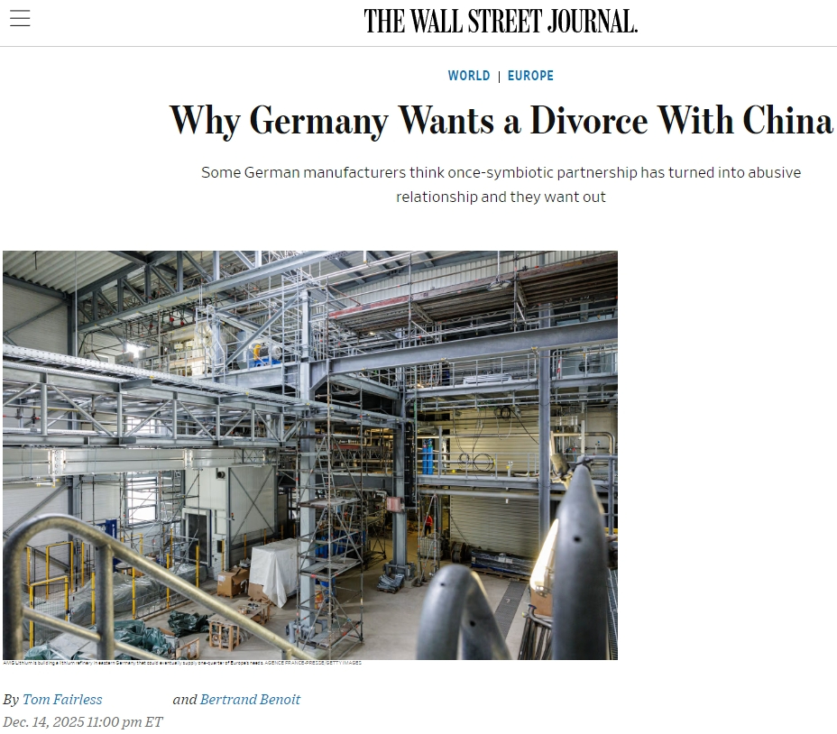 WSJ:德国为什么要与中国离婚以前德国给中国提供机器,中国用机器生产为世界生产,是不错的合作关系。后来中国自己造机器了,德国不满意了。大面上是这个事,这个文章提供了比较多的细节。一个比较吃惊的数据是,德国贸易与投资署预测2025年对华贸易逆差将达到870亿欧元,这都超过1000亿美元了。看到这种数字,德国人确实会慌。数据包含货物和服务贸易,但与中方口径差异很大,中方数据是,2025年前10月德国对华逆差为207亿美元,全年逆差估计260-270亿美元,不算太大。最大的差异,应该是德国把从荷兰、波兰等地的转口贸易算进去了。如中方数据,前10月对荷兰货物贸易顺差为619亿。荷兰不至于对中国有这么大逆差,应该是有不少又卖到德国去了。(这段不是文章中的内容,我解释下)德国汽车、电气设备、盾构机、化工,如果了解近几年行业的变迁,能直接看到德国商家的恐惧。不是在中国失去份额,不是在全球竞争不过,而是在欧洲老家、德国本土都打不过了。德国企业面对中国公司给出的价格,想不出办法。这文章渲染德国面对中国的竞争压力,德国政客的态度转变。但是也知道不好办,有些事不是政策变了就有用,很复杂,最终还是要看企业竞争力。