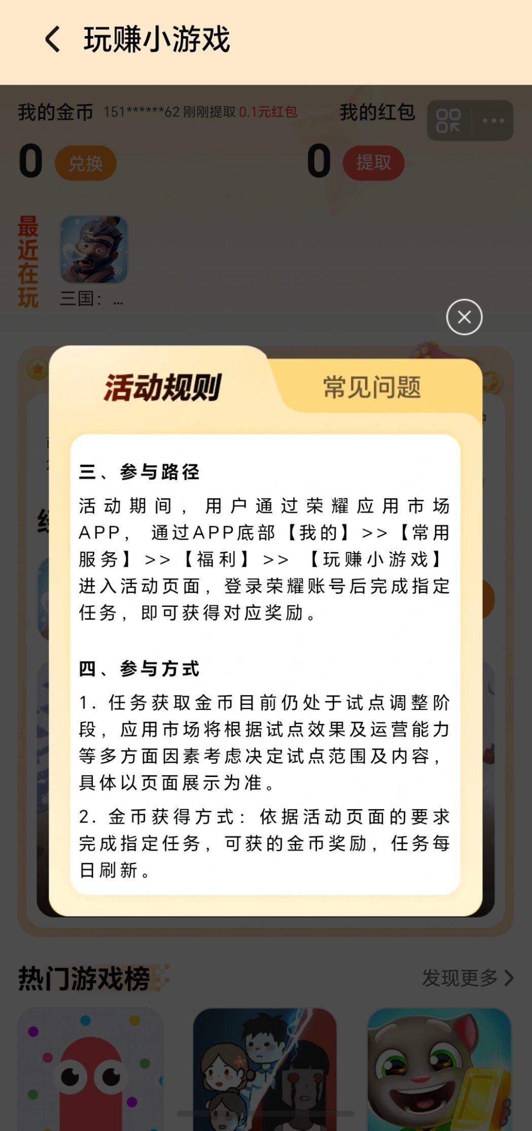 荣耀应用市场APP,通过APP底部【我的】>>【常用服务】>>【福利】>>【玩赚小游戏】 进入活动页面,登录荣耀账号后完成指定任务,即可获得对应奖励。