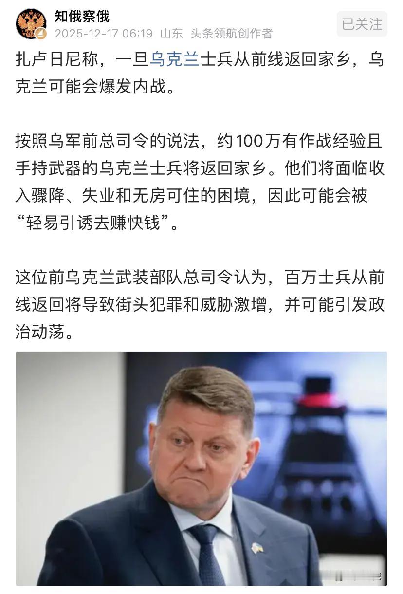 扎卢日内瞎担心,乌克兰一旦和平了,那些军人更珍惜来之不易的和平生活,现在每天都是把脑袋别裤腰带上打仗,回到老家,男人都是香饽饽,反而生活能更好!