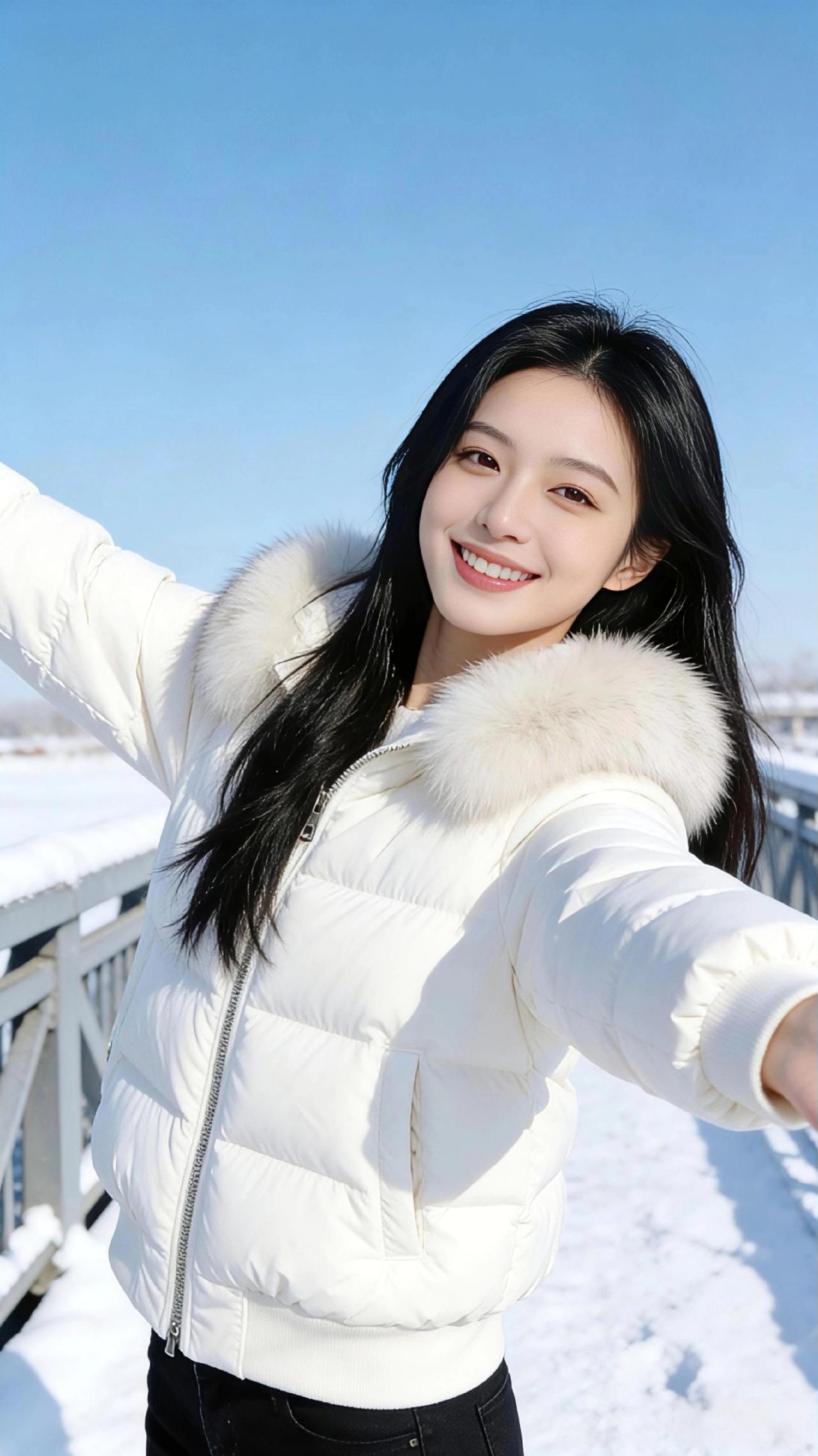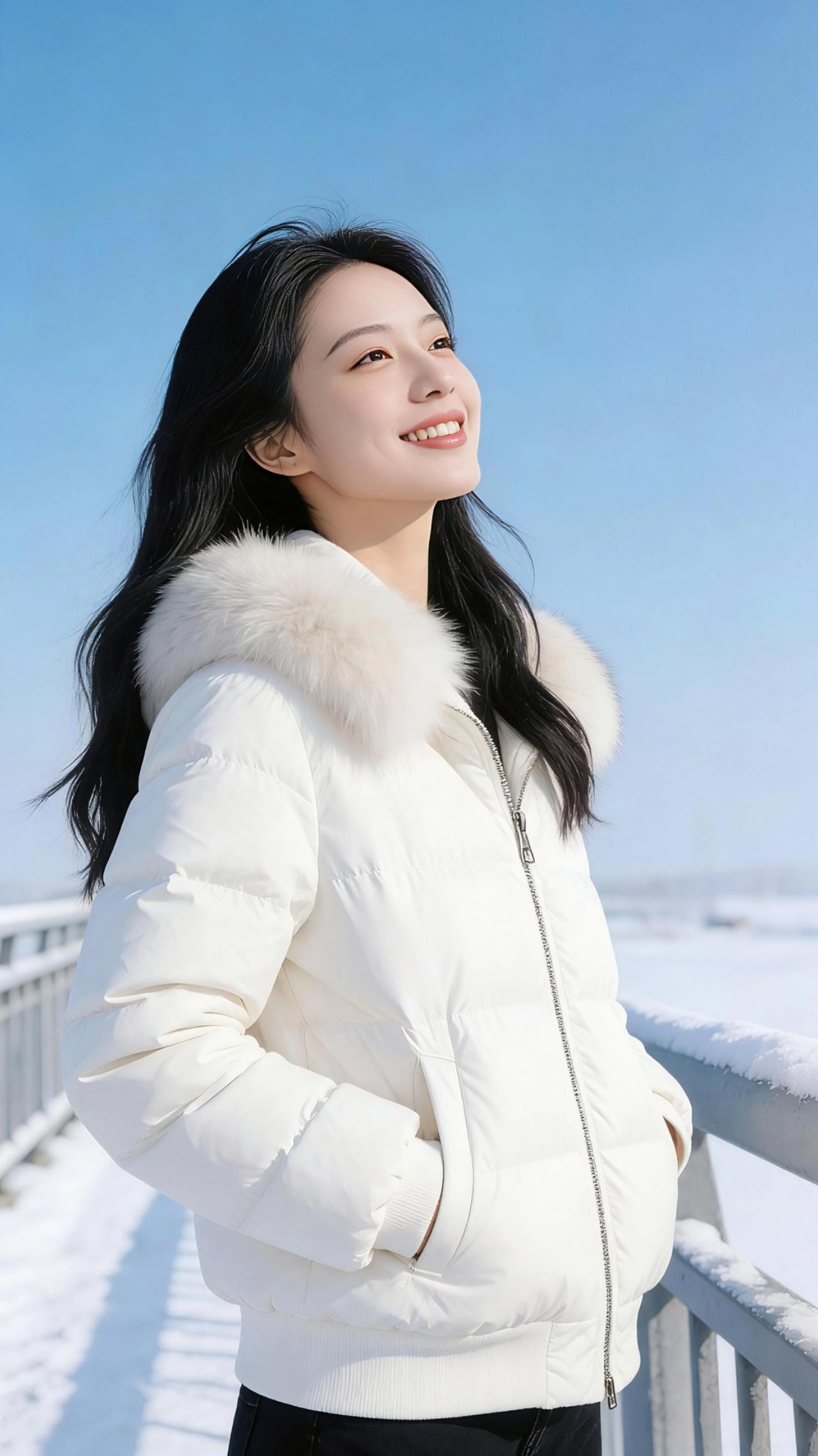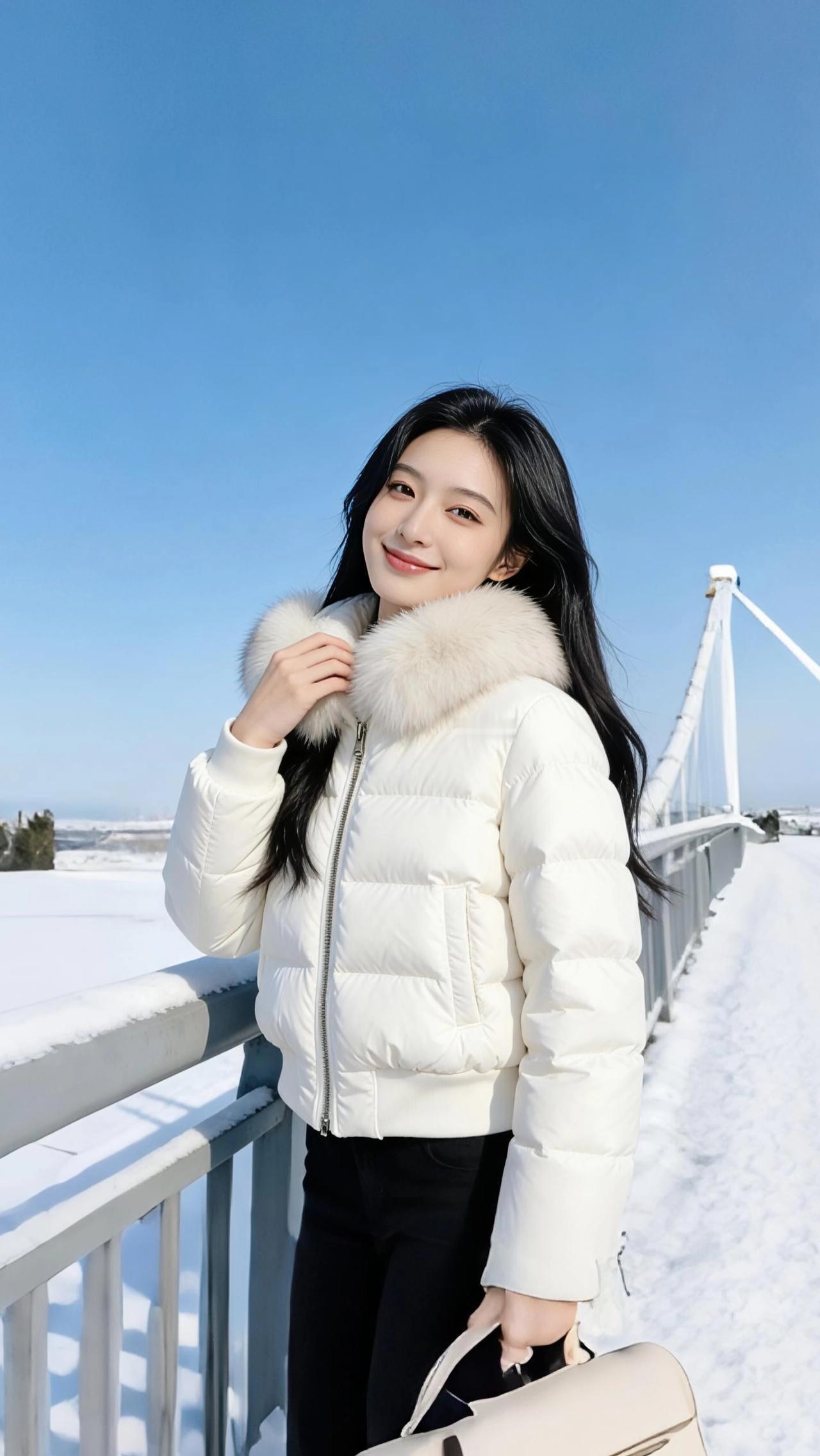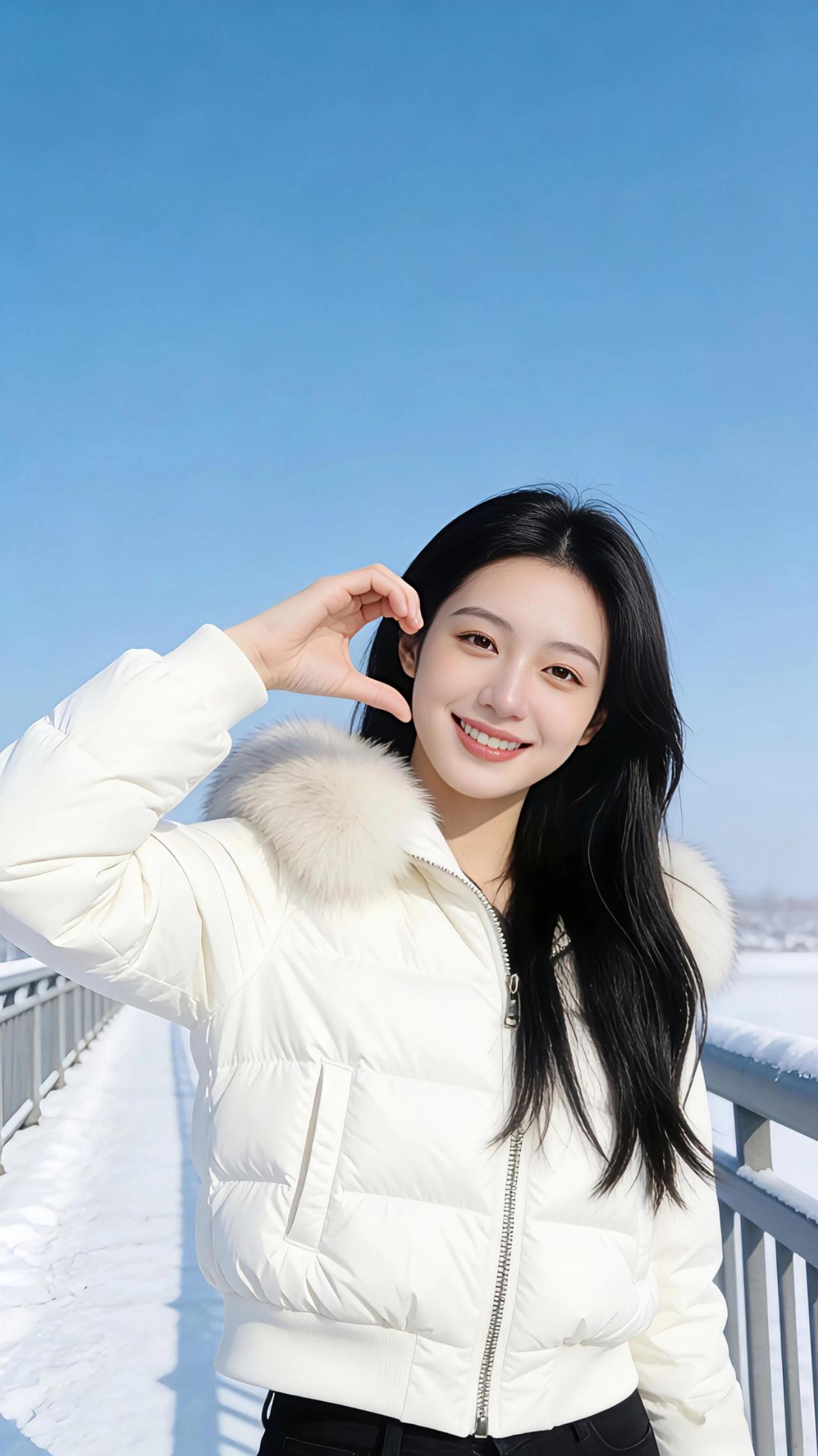 雪日晴空 冬日的风掠过雪原,把澄澈的蓝揉进天空里。我立在覆雪的桥栏边,白色羽绒服的毛领蹭着脸颊,绒软得像云朵的絮。 风掀起发梢,发丝缠上肩头的雪色,抬手拢了拢毛领,指尖触到的暖意,和眼前晃眼的日光撞个满怀。伸手比出心的形状,框住这一方蓝天与白雪,笑意便从唇角漫开,像雪地里初融的溪,清浅又鲜活。 脚下的雪簌簌响,远处的桥塔在晴空下描出简洁的白边,天地间只剩蓝与白的交响。原来冬日从不是萧瑟的注脚,当阳光吻上雪面,当风裹着清甜的凉,平凡的瞬间也成了揉进眼底的温柔诗行。 高级感穿搭 冬季穿搭 羽绒服穿搭 面包服
