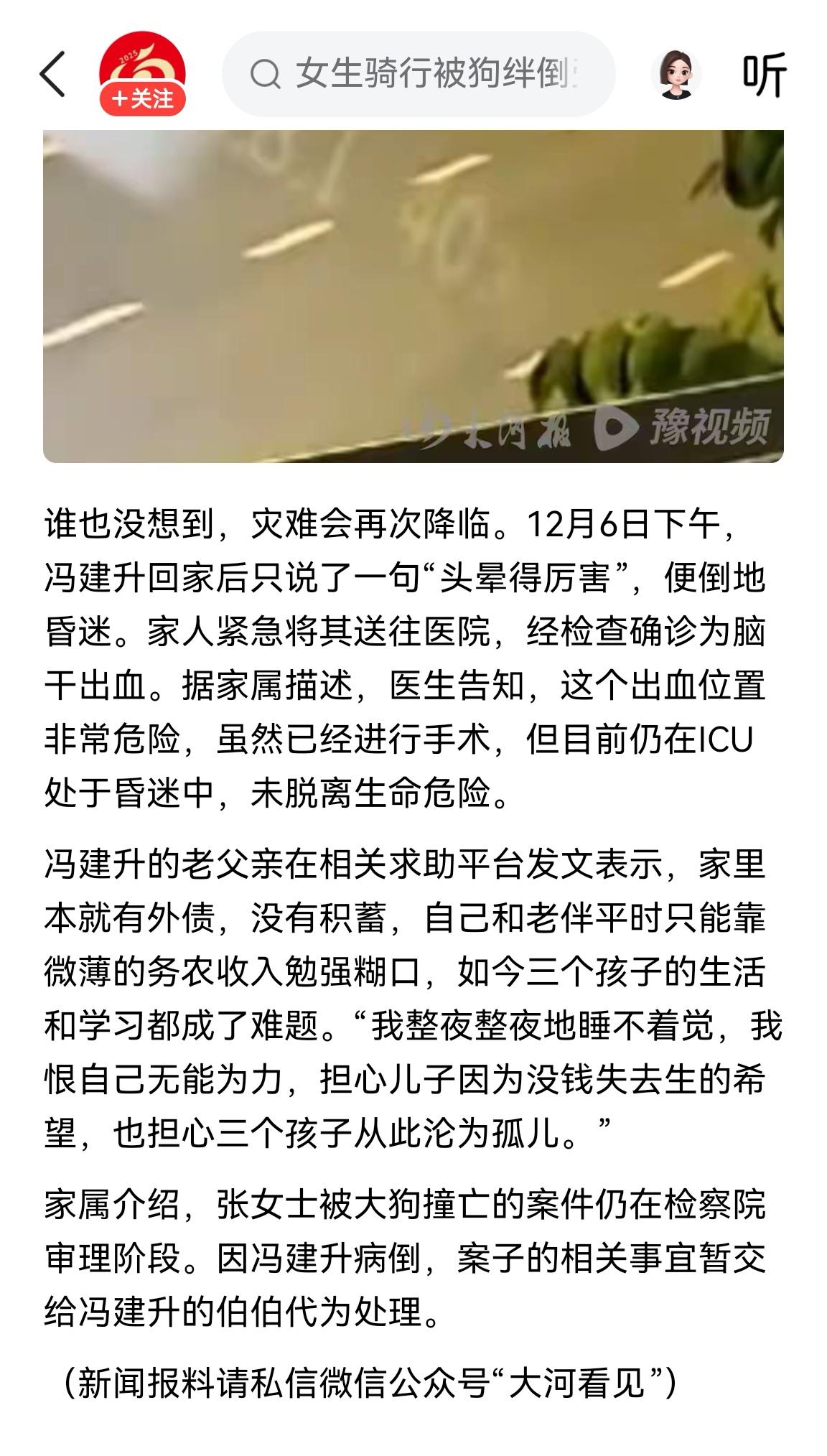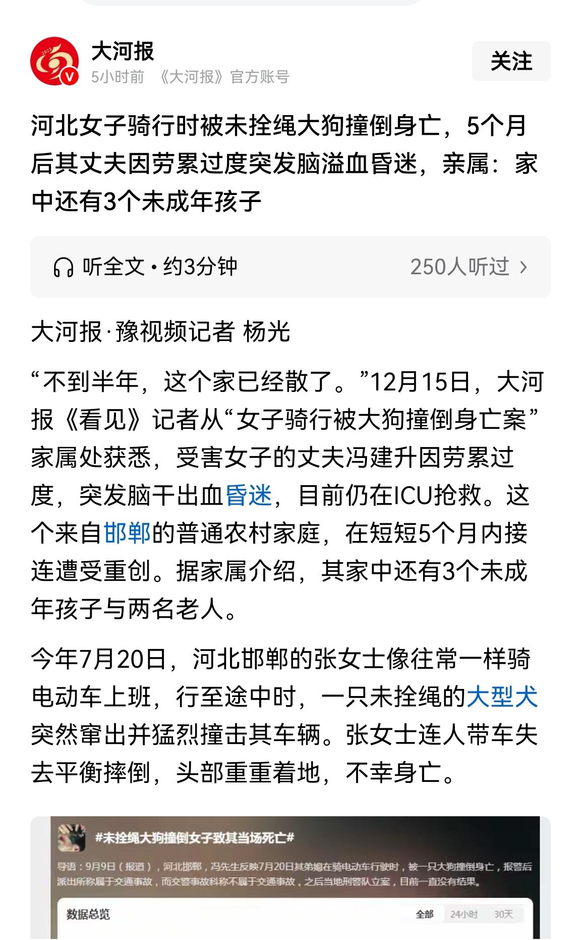只因下班路上被大狗撞倒,谁也想不到一个五口之家就因为这场意外短短几个月就能家破人亡。 年轻的母亲被大狗撞倒后头部着地,最后不幸去世。 家里顶梁柱孩子的爸爸,因为这突如其来的意外以及后续一系列问题疲于奔波,最终脑干出血直接倒下了,虽然经过了手术抢救但躺在ICU的他依然没有脱离生命危险。 三个未成年没有收入的子女以及几个月来疲于奔波后没有积蓄的家庭与外债。 这是何等的绝望与迷茫? 我国对大型犬的管理一定要提高到新高度,不能再被那群“圣母”所左右。 一个五口之家惨剧就摆在眼前,普通人的一生,只是正常上下班,他们又有什么错?