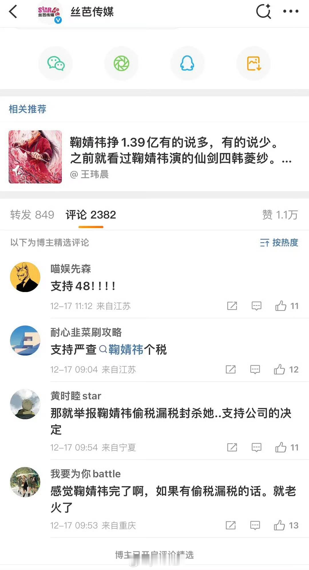 鞠婧祎每月25万元固定工资丝芭说鞠婧祎经常报销和工作无关支出丝芭给自己微博的评论区开了精选,故意精选出要查鞠婧祎税务的评论,好恨啊
