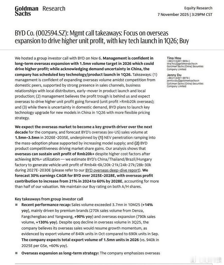近半年来,中国汽车市场竞争加剧,汽车板块股价整体表现弱于大盘,市场悲观情绪蔓延,虽然行业处于调整周期,但比亚迪却成为资本眼中的香饽饽。进入四季度以来,高盛,花旗,摩根士丹利等国际顶尖投行密集发布深度研报纷纷给予比亚迪买入”或增持,评级市场发展预期一片向好,彰显资本市场看好比亚迪未来长期发展的信心。资本对于比亚迪这份独特的青睐。实则是基于比亚迪长期价值做出的理性判断。作为全球投资者的权威参考,国际顶尖投研机构凭借专业的信息整合与研判能力,能够穿透行业短期波动,看到比亚迪未来的增长潜力。高盛在11月7日的研报中明确指出:海外市场将成为比亚迪未来十年的核心增长领域。,依托完善的车型矩阵与强大的产品力,比亚迪2025年至2028年盈利年均复合增长率将达30%,海外利润贡献度将从2024年的21%升至2028年的60%,2026至2035年海外销量有望达150万至350万辆,为此高盛坚定维持其A股、H股“买入”评级,A股目标价144元人民币,相较于12月9日收盘价仍有约50%上涨空间,体现出其对于比亚迪未来市场价值的高度认同。