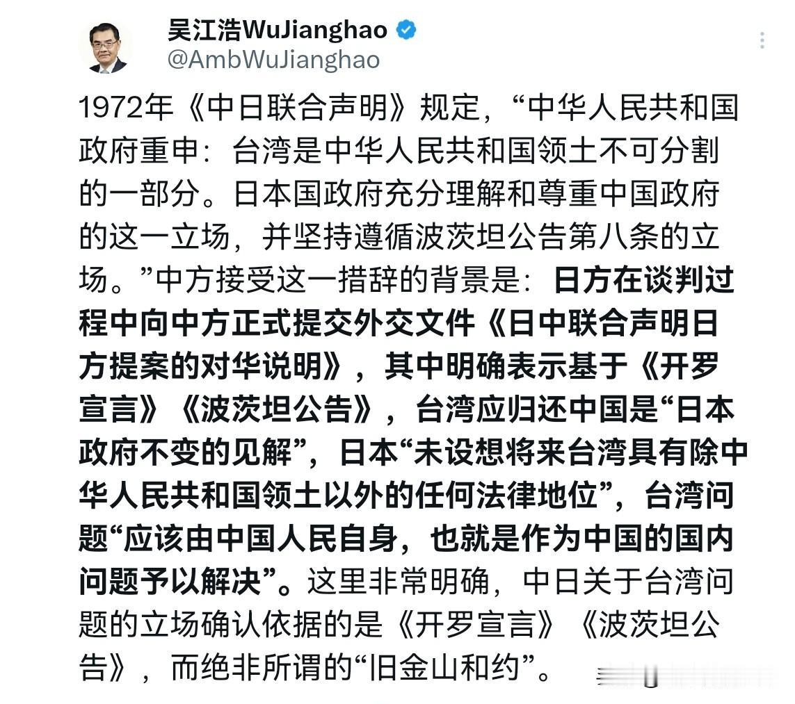继续施压!在高市早苗扭扭捏捏的表示“既然外界认为我的答辩超出了历届政府立场,我会以此为戒,审慎参与今后的国会讨论”之后,我方不给高市早苗一点钻空子的机会。12月17日,中国驻日大使吴江浩写到,1972年《中日联合声明》规定,中华人民共和国政府重申:台湾是中华人民共和国领土不可分割的一部分。日本国政府充分理解和尊重中国政府的这一立场,并坚持遵循波茨坦公告第八条的立场。 吴江浩大使表示,中方接受这一措辞的背景是:日方在谈判过程中向中方正式提交外交文件《日中联合声明日方提案的对华说明》,其中明确表示基于《开罗宣言》《波茨坦公告》,台湾应归还中国是“日本政府不变的见解”,日本“未设想将来台湾具有除中华人民共和国领土以外的任何法律地位”,台湾问题“应该由中国人民自身,也就是作为中国的国内问题予以解决”。 这里非常明确,中日关于台湾问题的立场确认依据的是《开罗宣言》《波茨坦公告》,而绝非所谓的“旧金山和约”。很显然,在高市早苗看起来软化立场,并意识到自己的表态有问题之后,我方并没有肯定高市早苗,而是继续对其施压。我方拿出这些历史事实的目的是什么呢?一句话,高市早苗的表态,仍在糊弄我们,我们就是要让高市早苗看看中日关系建交的基础到底是什么? 很显然,无可辩驳的事实是,台湾是中国不可分割的一部分,日本承认台湾问题是我们的内政问题。因此,高市早苗以存亡危机事态跟台湾问题相关联,这严重违反了中日建交的基础。如果高市早苗真的意识到自己错了,那高市早苗的选择只有撤回恶劣言论这一条路。当然,中日关系的急剧恶化因高市早苗的挑衅已经持续一个多月,高市早苗不改正,我们也不会着急降温,日本也别想着打马虎眼妄图蒙混过关。我们会继续保持施压强度,跟我们对耗,我们完全耗得起!