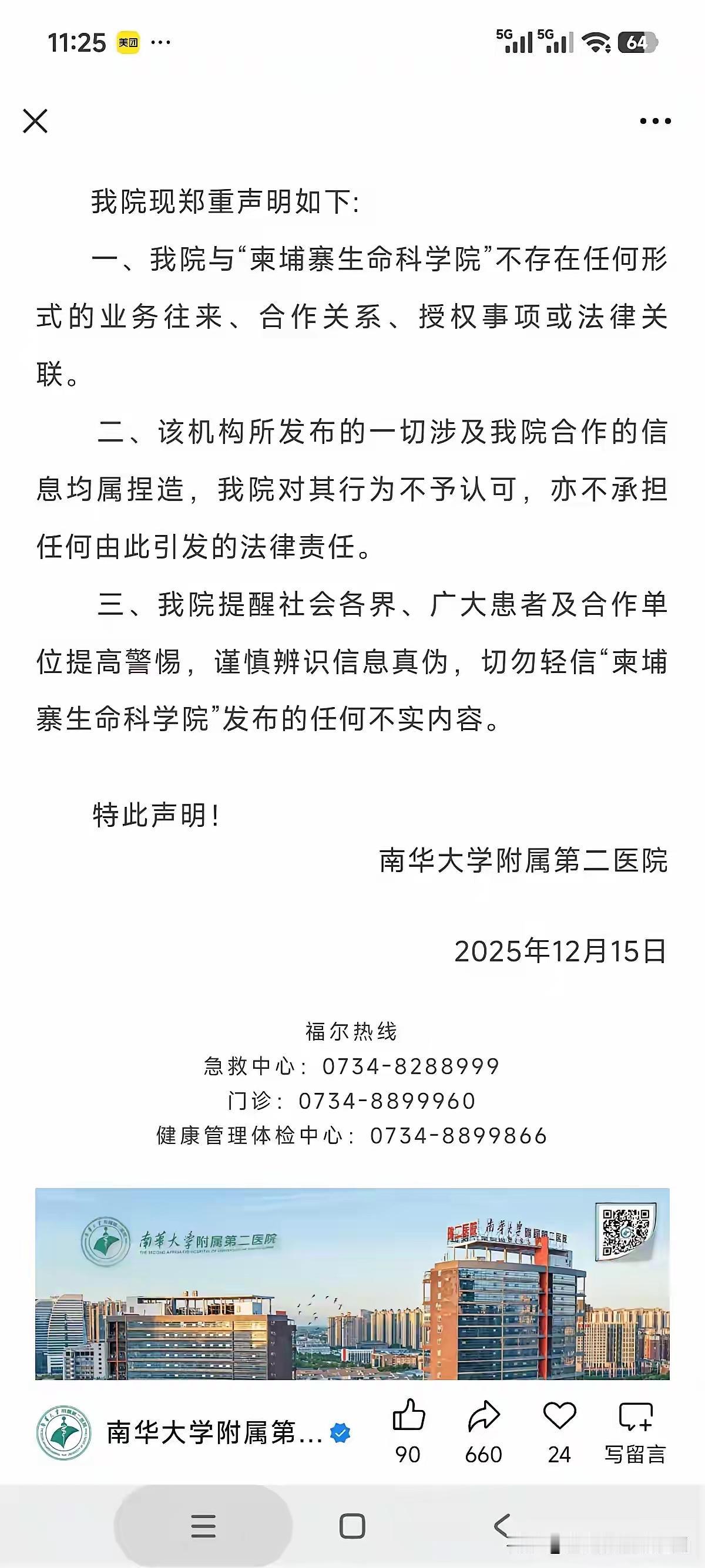 南华大学附属二院辟谣了,不存在与“柬埔寨生命科学院”有任何业务往来、合作关系、授权事项或法律关联等内容,请广大民众切勿轻信“柬埔寨生命科学院”发布的不实内容。南华附属二院的声明坚定有力,名单上的其他单位,估计也会陆续发表辟谣声明。 支持南华大学附属二院向该单位索赔。
