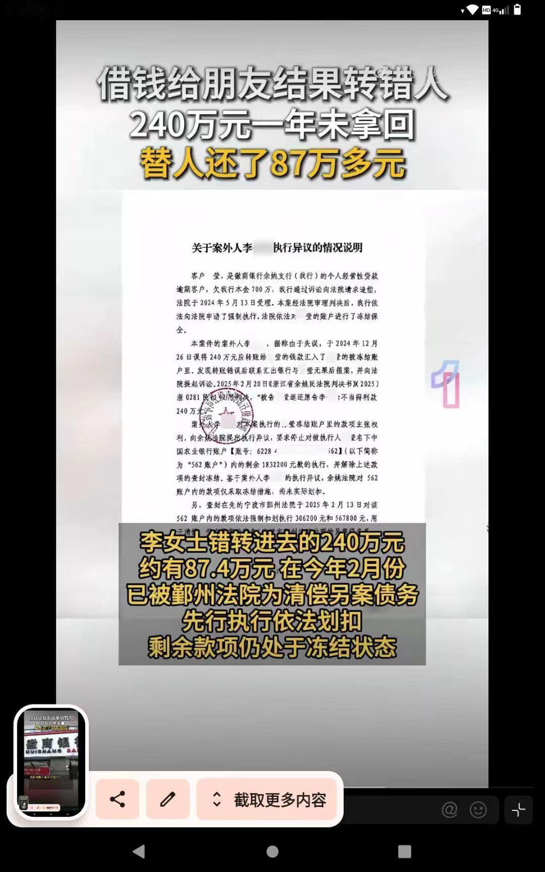 错转了巨款一直拿不回来! 去年12月26日,浙江宁波的李女士在一次转账时误操作,将240万元转入他人账户,到现在快一年了,仍无法取回。这笔误转的巨款,如同一道无形的峭壁,挡在李女士和她240万元之间。令人唏嘘的是,在这场金额巨大的资金迷宫中,她不仅丢失了钱,更丢失了当下“信任”的底线。我们常说“钱不是万能的”,但面对这样的误转事件,让人不得不去深思——钱在现代社会到底带来了什么? 李女士的遭遇其实并非个例。数字时代,转账便捷到“指尖操作”,但一不留神,一句电话、一点慌乱,都能变成“灾难”的导火索。更让人心寒的是,收款方竟然迟迟不予回应,更有网友爆料说这个账户早就背负700万元债务,已被“特殊监控”。这其中,是道德的缺失,还是法律的缺位?当误转巨款流入一张“烂账”的名下,想要拿回钱款,几乎成了一场硬仗。 回头想想,李女士当时那句“帮朋友还款”的初衷多么纯粹,我们每个人心中或多或少都有帮助他人的愿望,愿意伸出援手。然而,结果却成了帮别人还债的错付代价。这让人反思:在利益和情感的交织中,信任是否变得脆弱?而面对谁都可能犯的“操作失误”,我们究竟该如何自我保障? 这件事的背后,其实折射出普遍存在的一个社会问题——金融安全意识与法律保护之间的落差。银行系统虽有风控机制,但对于用户侧操作错误的“防范”依然不足;而当错误发生,法律和司法途径又显得漫长且充满变数。普通人该如何在万亿数字资金流转的海洋中保护自己?更何况,许多同名同姓的“雷区”没有被及时清理,稍不注意就可能陷入无尽纠纷。 李女士的案件还在审理,但它留给我们的,不仅仅是对“误转款”个案的关注,更激起了对现代社会信任与安全机制的深刻反思:当钱成为人与人之间最直接的纽带,假如这根纽带断裂,我们该如何预防、修复甚至重建信任?你有没有过类似的“转账惊魂”?你觉得法律应该如何在保护个人资金安全上做出改进?欢迎在评论区分享你的故事和看法,让我们一起探讨这场现代金融安全的“战争”,为自己和他人筑起一道坚固防线!社会百态 社会新闻