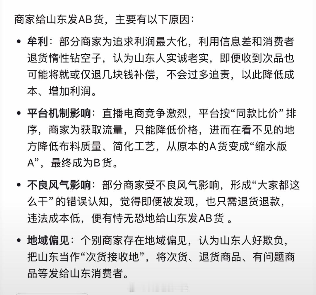 怎么电商还有地域歧视,好多山东人反应买A发B、货不对板,也有商家说专门给山东人发次品,这么干还不如不卖给山东地区