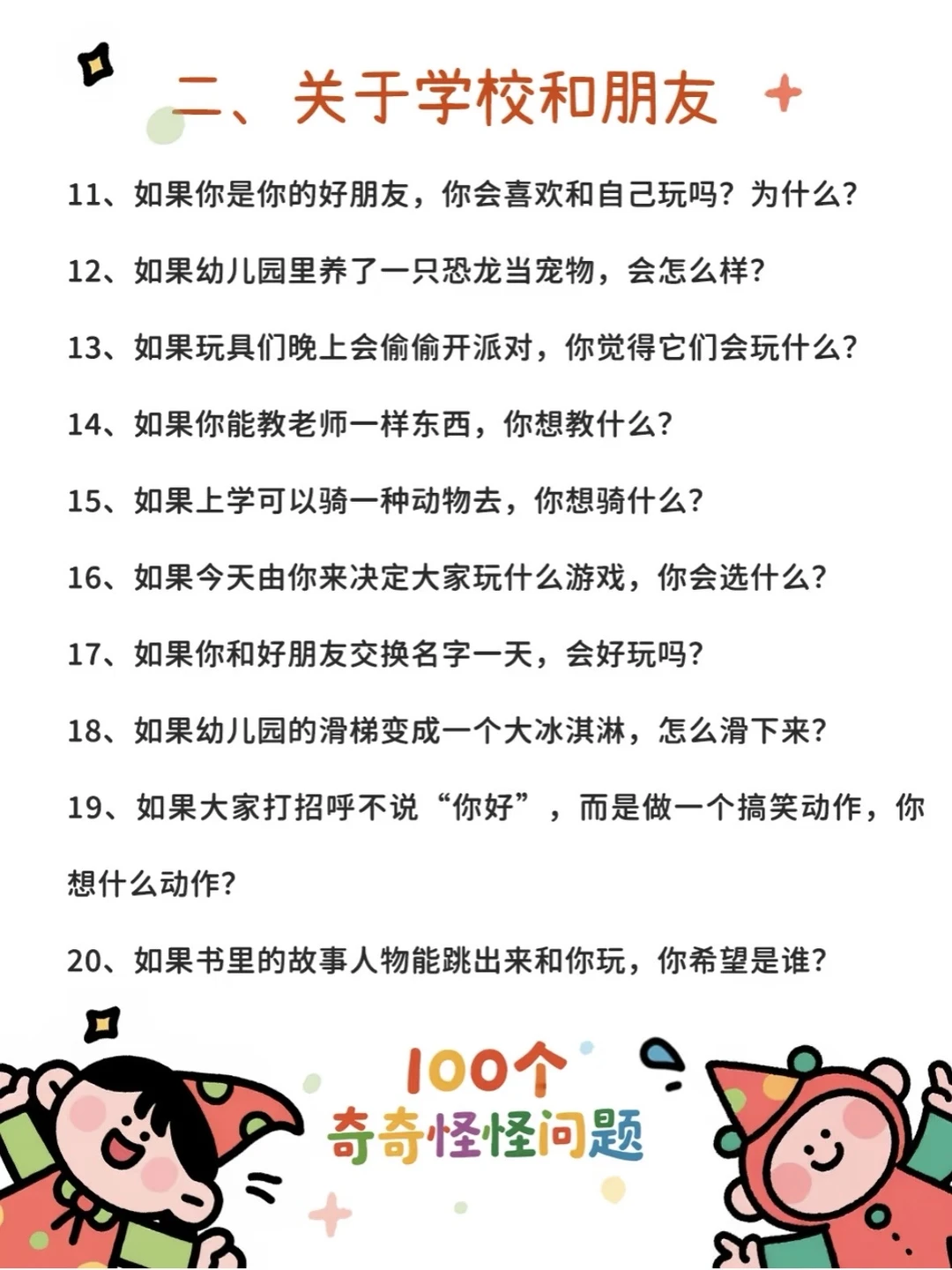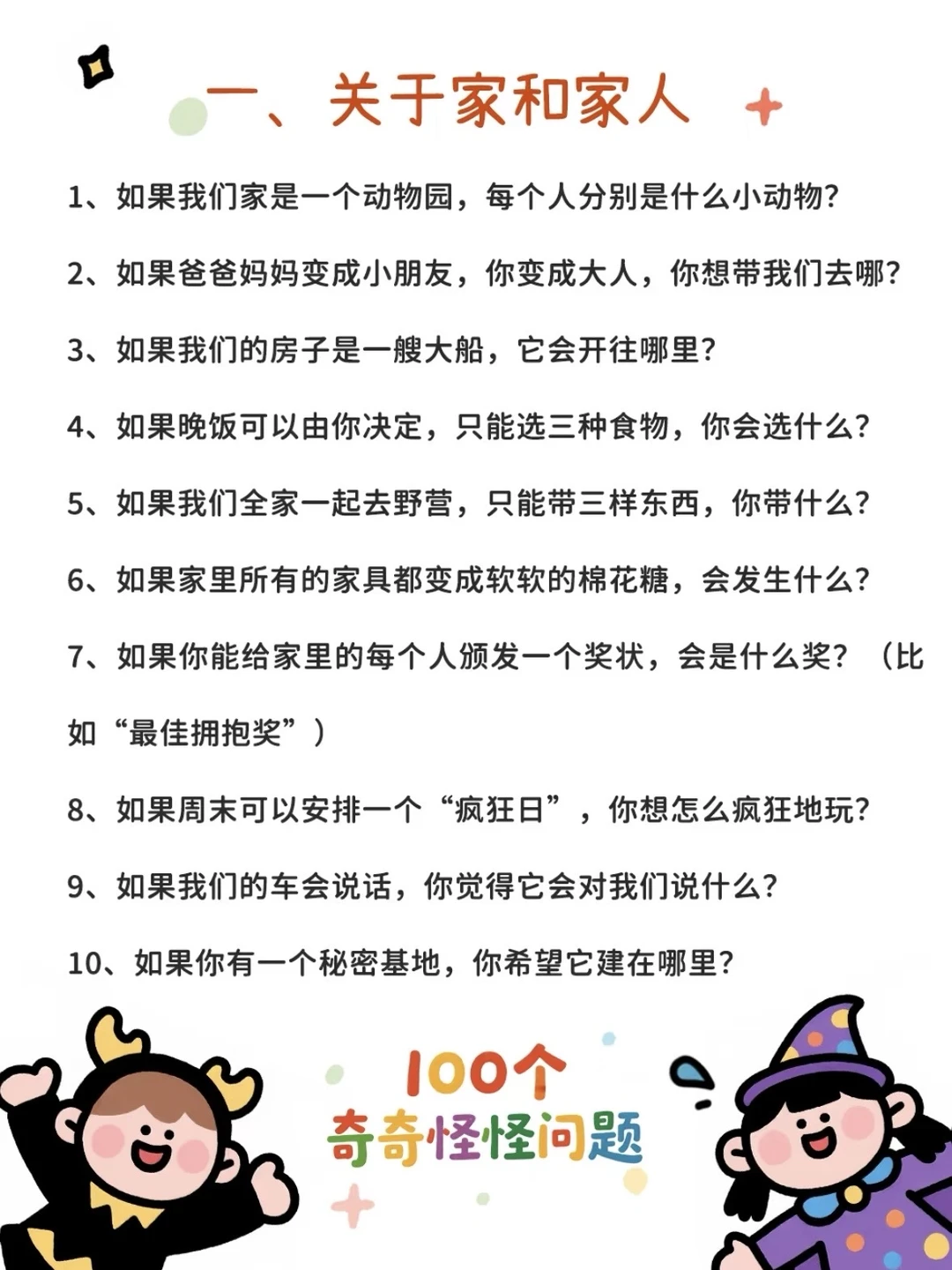 不知道各位爸妈有没有同感,孩子一旦变成“小话痨”之后,那些日常的“吃饭了吗”“今天学了什么”之类的问答,他们常常爱答不理。其实呀,他们的小脑袋里更爱琢磨那些天马行空、稀奇古怪的问题,那些充满奇思妙想的话题才能真正点燃他们的表达欲! 我特意整理了100个特别适合小朋友的奇趣话题,用词简单,却充满趣味和讨论空间~试着跟娃聊了几个,他一下子就打开了话匣子,讲得头头是道,特别投入!这些话题不仅能激发孩子的想象力,还能让我们悄悄走进他们的小世界~各位家长,赶紧收藏用起来吧!